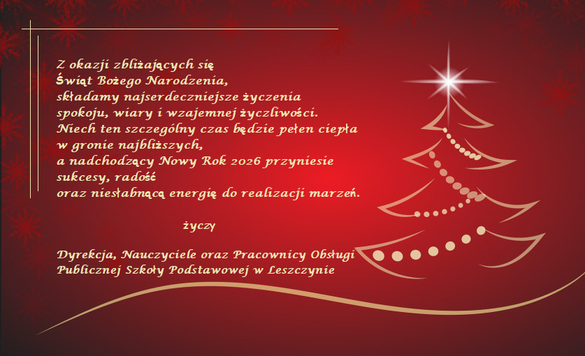 Aktualności 83 18-12-2025 Z okazji zbliżających się Świąt Bożego Narodzenia, składamy najserdeczniejsze życzenia spokoju, wiary i wzajemnej życzliwości. Niech ten szczególny czas będzie pełen ciepła w gronie najbliższych, a nadchodzący Nowy Rok 2026 przyniesie sukcesy, radość oraz niesłabnącą energię do realizacji marzeń. życzy Dyrekcja, Nauczyciele oraz Pracownicy Obsługi Publicznej Szkoły Podstawowej w Leszczynie 0.0 Ostatnia modyfikacja: czwartek 18 grudnia 2025 15:08 Powiązane artykuły: Wielkanoc 2026 - życzenia Udział w ogólnopolskiej akcji BohaterON - 2025/2026 Olimpiada Mitologiczna 2025 Wyniki konkursu Alfik Matematyczny 2025 Akcja charytatywna „Paczuszka dla Maluszka" 2025 Jasełka i Wigilia - 2025 „Mała książka – wielki człowiek" - 2025 Spotkanie z podróżnikiem - Indie 2025 Paczuszka dla Maluszka - 2025 OTRZĘSINY KLASY 4 I ZABAWA ANDRZEJKOWA – 26.11.2025r. 0