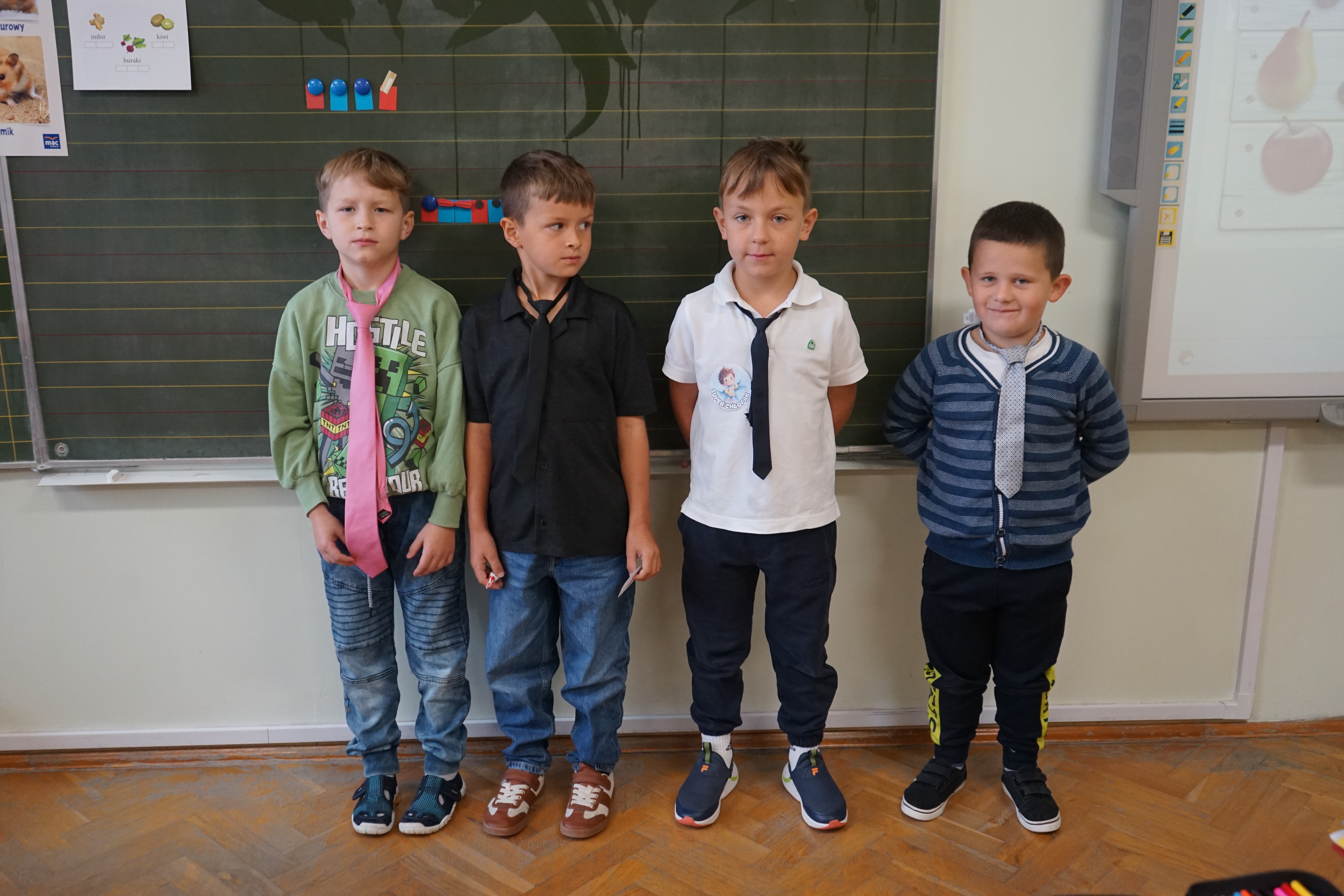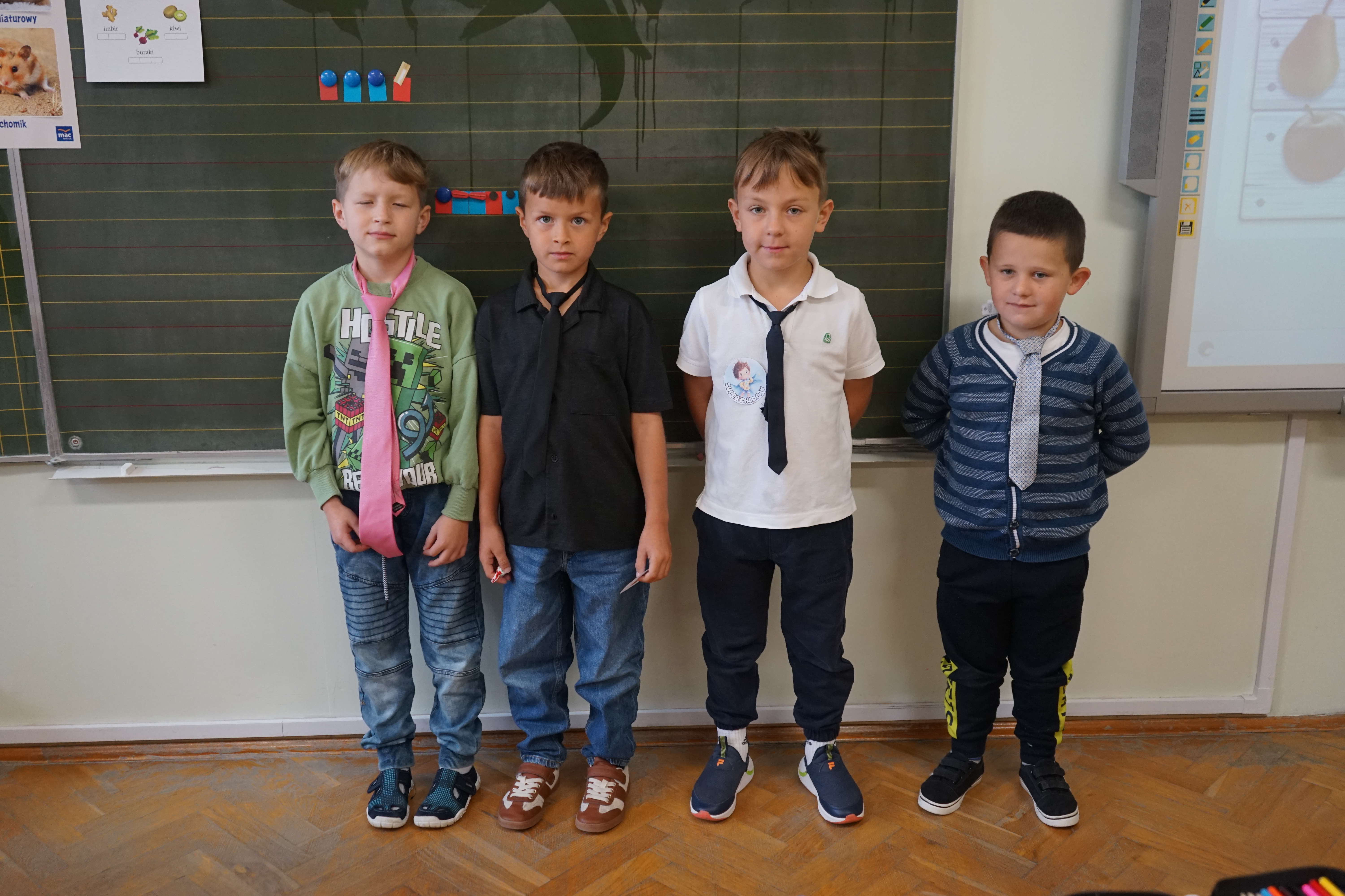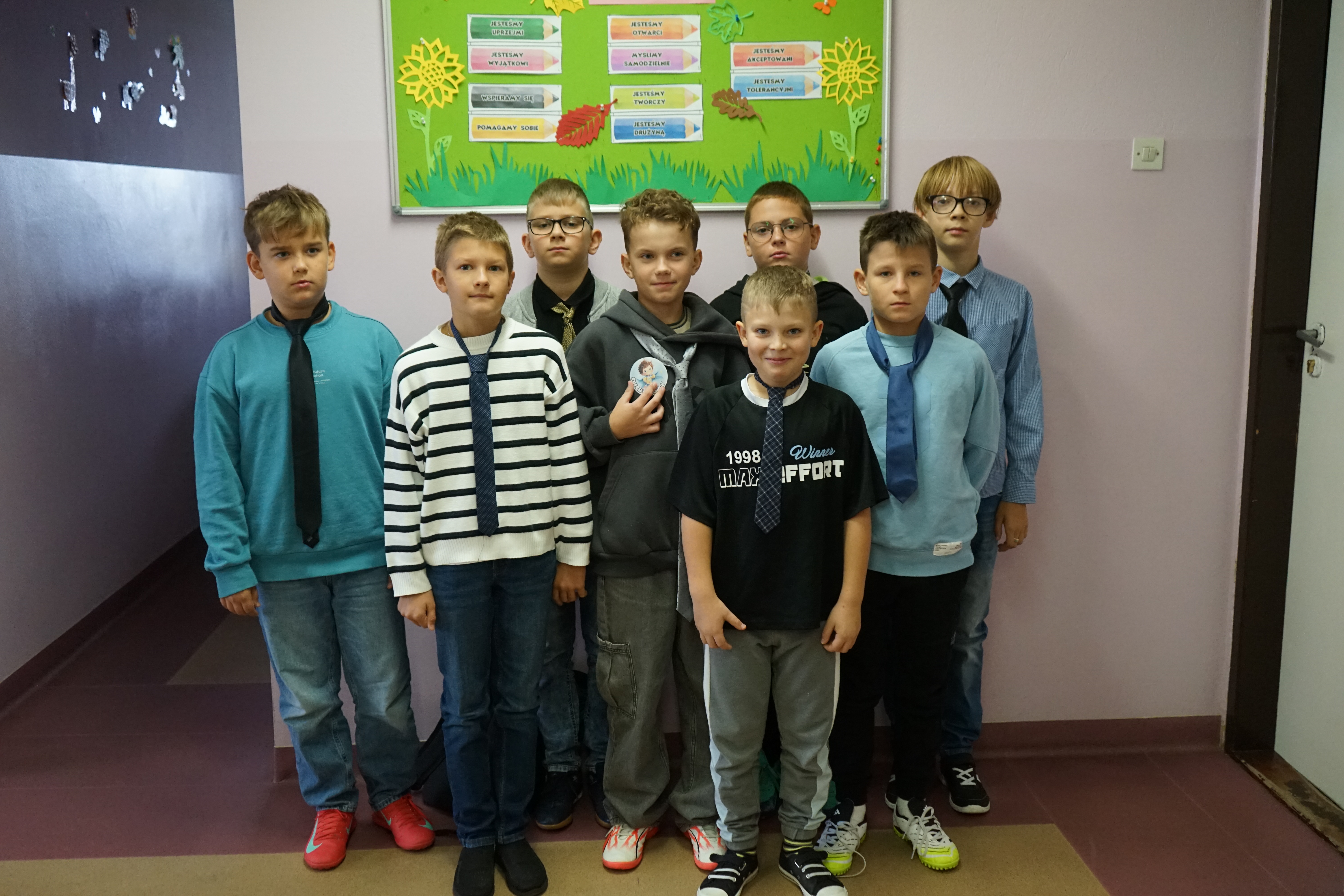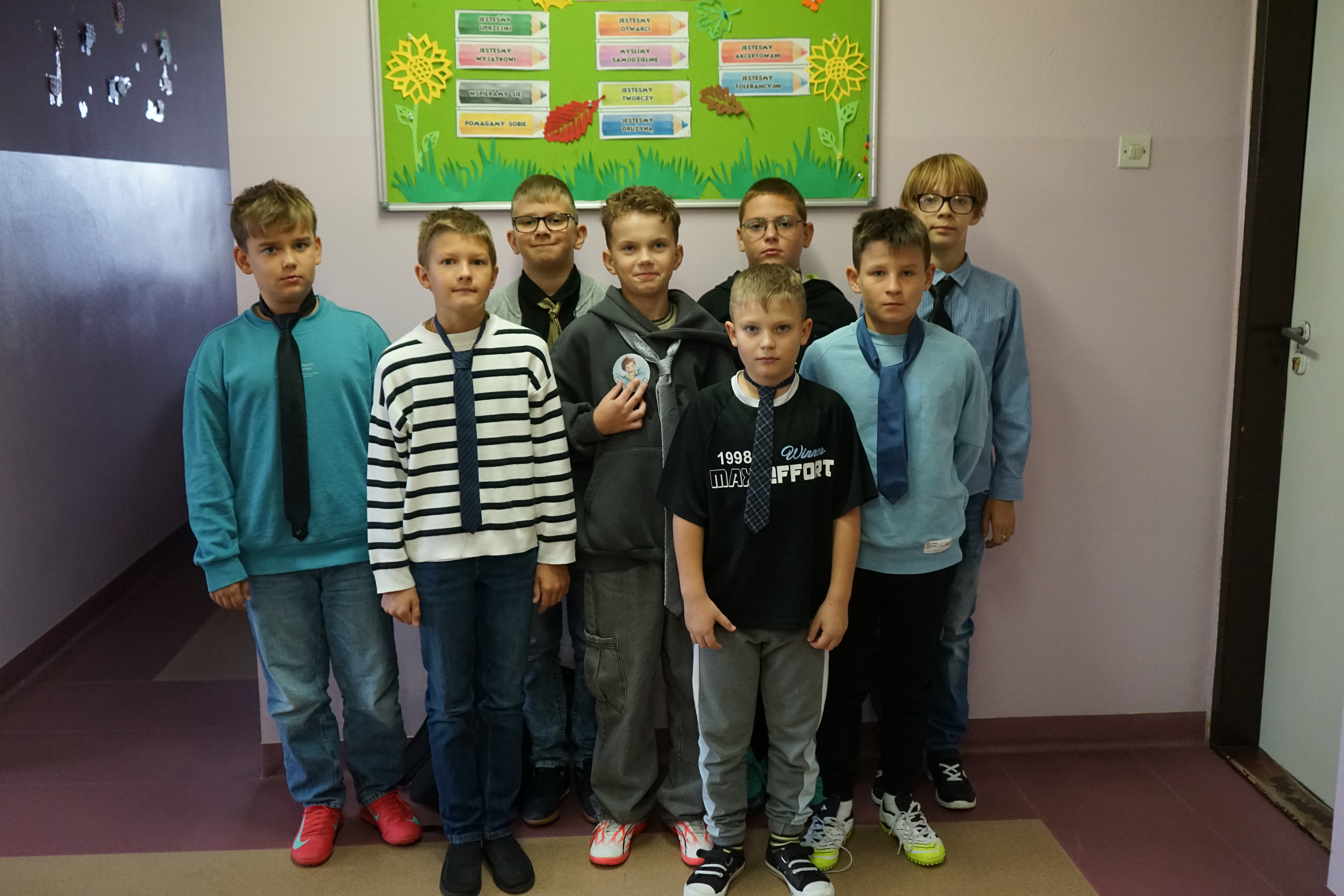 Aktualności 158 2-10-2025 30 września obchodziliśmy Dzień Chłopaka. Z tej okazji Samorząd Uczniowski ogłosił akcję zachęcającą wszystkich chłopców do założenia tego dnia krawata - nieodzownej ozdoby męskiego stroju. Uczniowie wzorowo przygotowali się do świętowania i zaprezentowali kolorowe krawaty, które dodały im powagi i elegancji. Koleżanki z samorządu wręczyły wszystkim chłopcom, zarówno tym młodszym, jak i starszym odznakę SUPER CHŁOPAK oraz coś słodkiego. Również w klasach nie zabrakło życzeń oraz drobnych upominków. Cały dzień upłynął w miłej atmosferze. 0.0 Ostatnia modyfikacja: -/- Powiązane artykuły: Dzień Świętego Patryka - świętujemy po irlandzku I Dzień Wiosny 2026 Pierwszy Dzień Wiosny i Dzień Kolorowej Skarpetki w naszej szkole Dzień Kobiet 2026 Udział w ogólnopolskiej akcji BohaterON - 2025/2026 Olimpiada Mitologiczna 2025 Dzień Babci i Dziadka 2026 Wyniki konkursu Alfik Matematyczny 2025 Boże Narodzenie 2025 - życzenia Akcja charytatywna „Paczuszka dla Maluszka" 2025 0