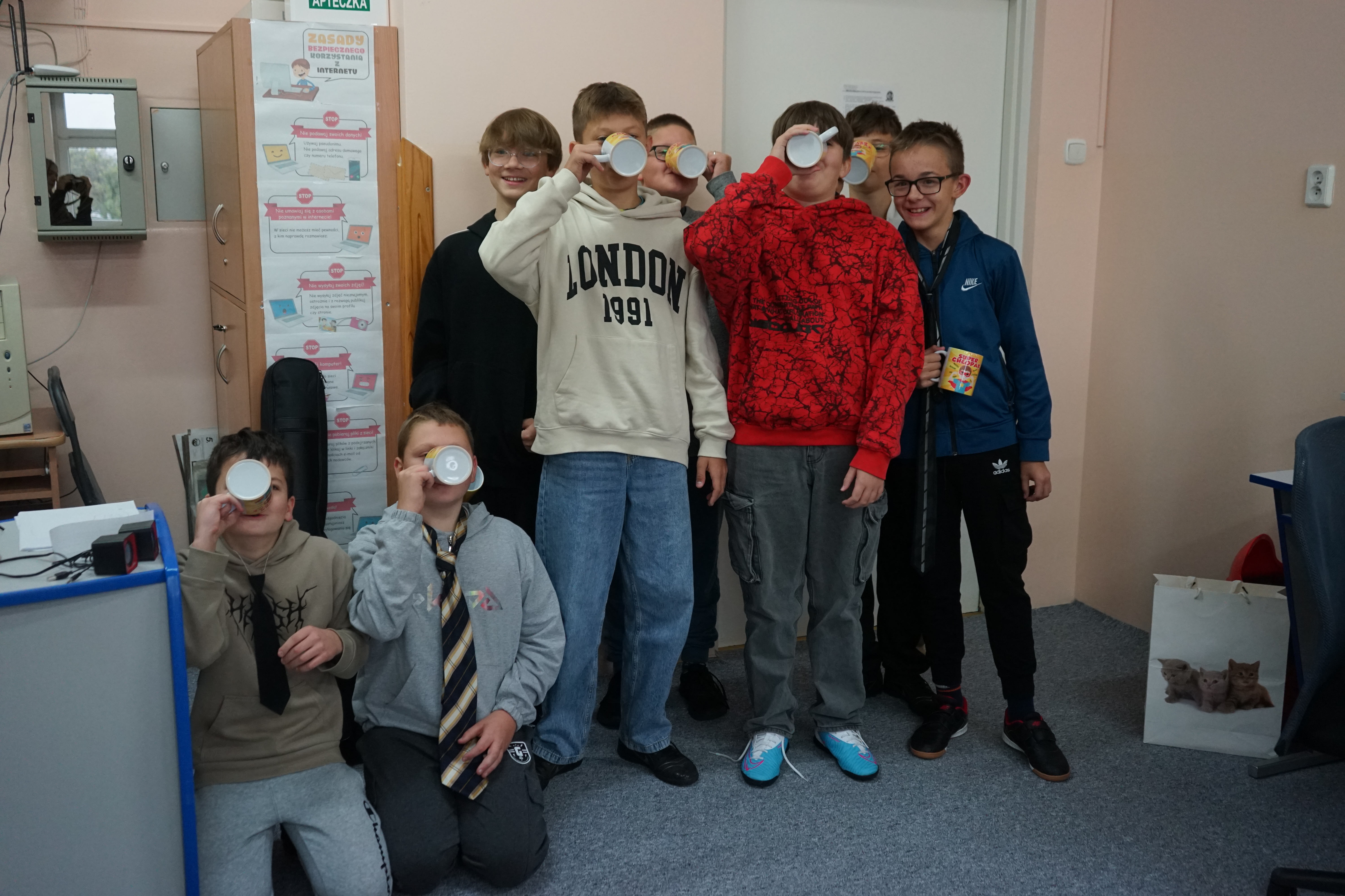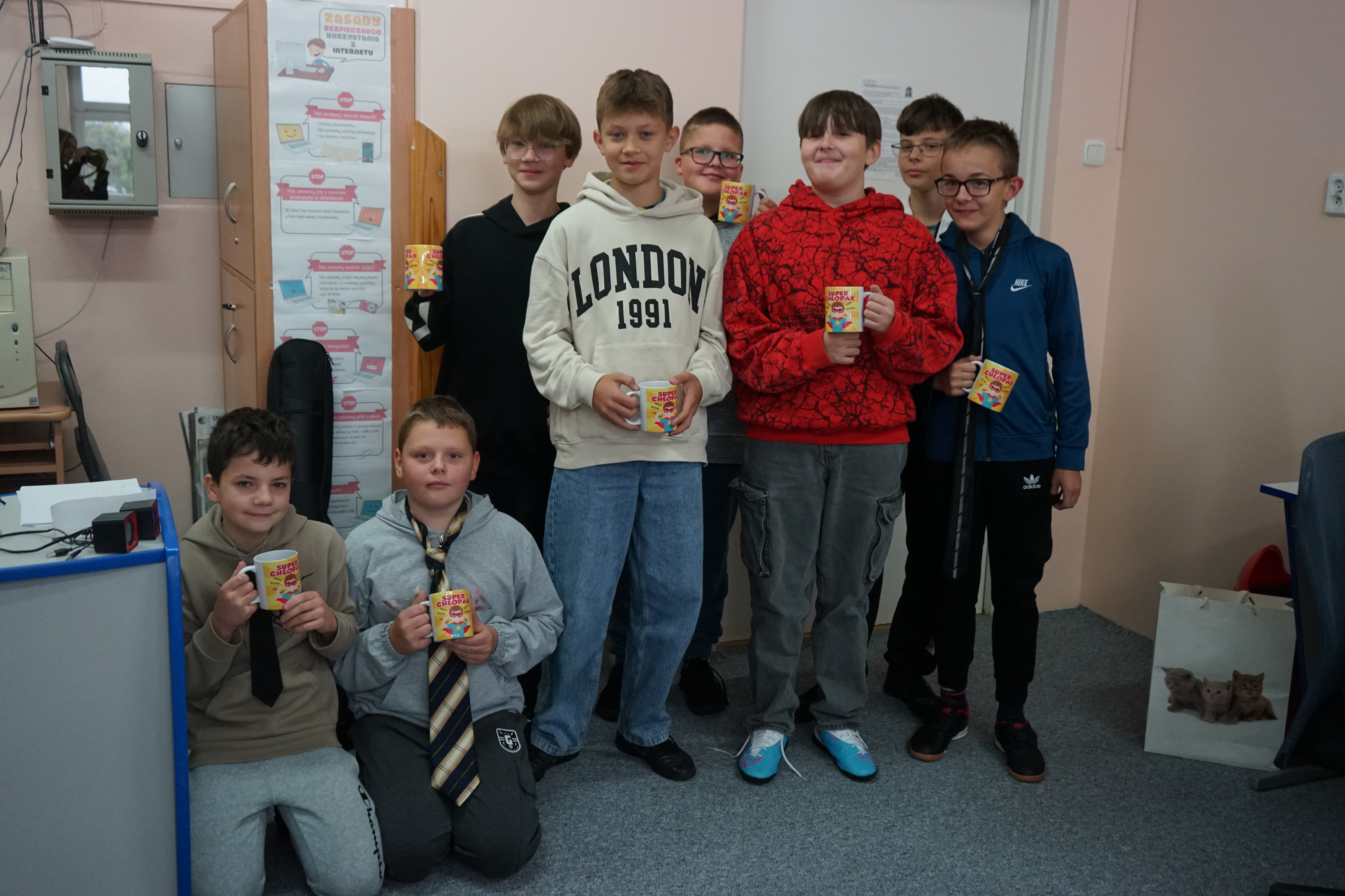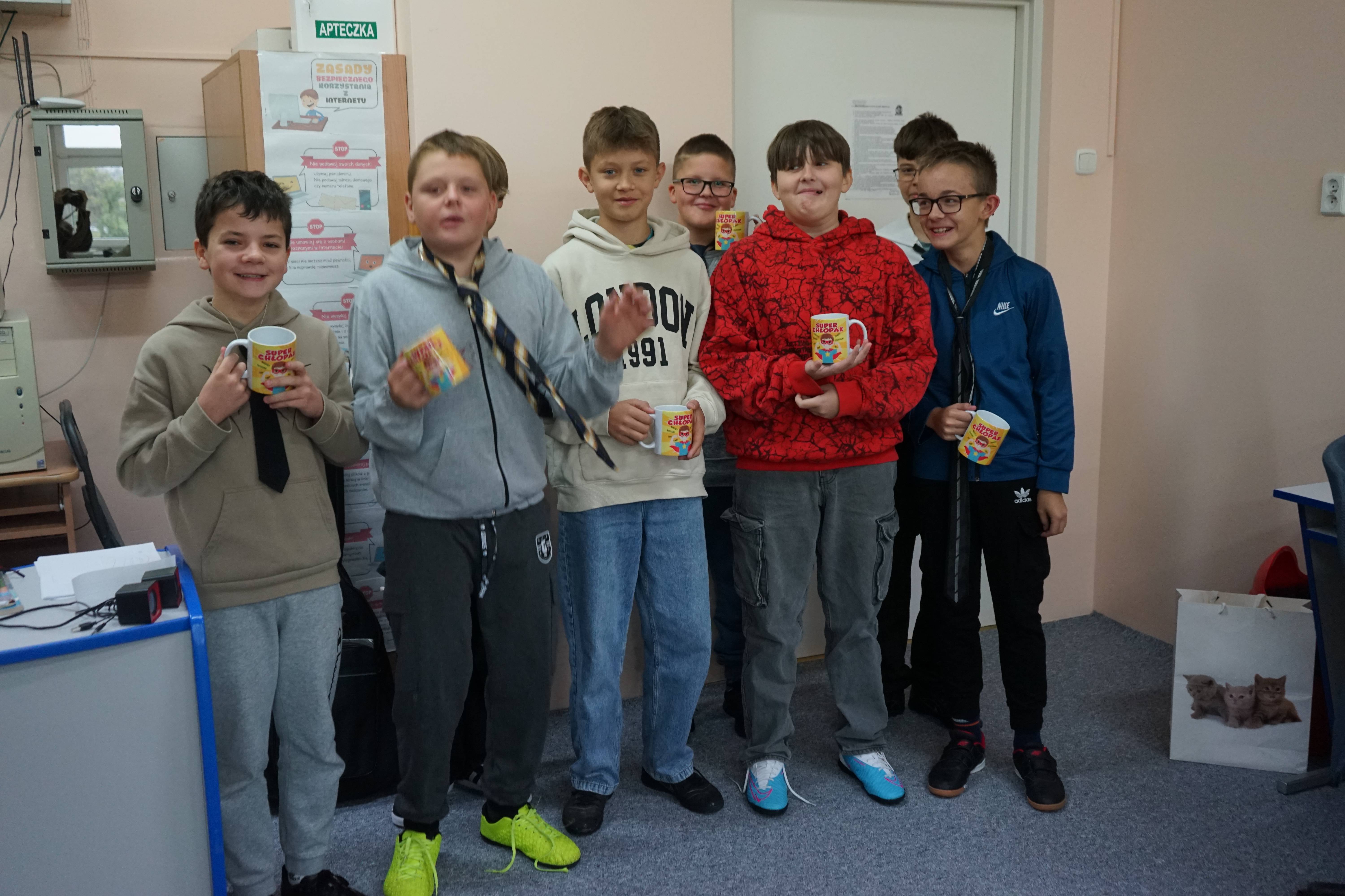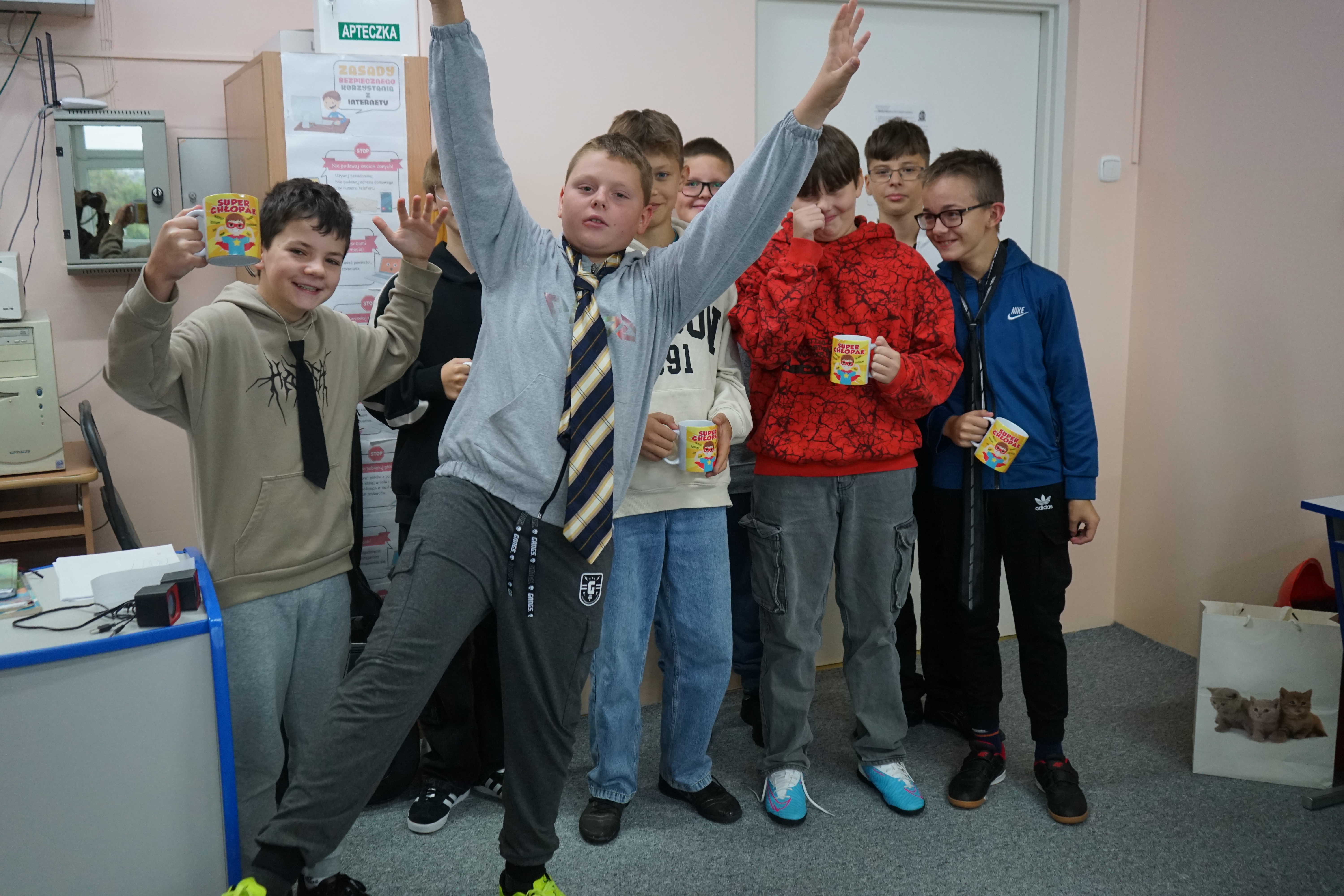 Aktualności 158 2-10-2025 30 września obchodziliśmy Dzień Chłopaka. Z tej okazji Samorząd Uczniowski ogłosił akcję zachęcającą wszystkich chłopców do założenia tego dnia krawata - nieodzownej ozdoby męskiego stroju. Uczniowie wzorowo przygotowali się do świętowania i zaprezentowali kolorowe krawaty, które dodały im powagi i elegancji. Koleżanki z samorządu wręczyły wszystkim chłopcom, zarówno tym młodszym, jak i starszym odznakę SUPER CHŁOPAK oraz coś słodkiego. Również w klasach nie zabrakło życzeń oraz drobnych upominków. Cały dzień upłynął w miłej atmosferze. 0.0 Ostatnia modyfikacja: -/- Powiązane artykuły: Dzień Świętego Patryka - świętujemy po irlandzku I Dzień Wiosny 2026 Pierwszy Dzień Wiosny i Dzień Kolorowej Skarpetki w naszej szkole Dzień Kobiet 2026 Udział w ogólnopolskiej akcji BohaterON - 2025/2026 Olimpiada Mitologiczna 2025 Dzień Babci i Dziadka 2026 Wyniki konkursu Alfik Matematyczny 2025 Boże Narodzenie 2025 - życzenia Akcja charytatywna „Paczuszka dla Maluszka" 2025 0