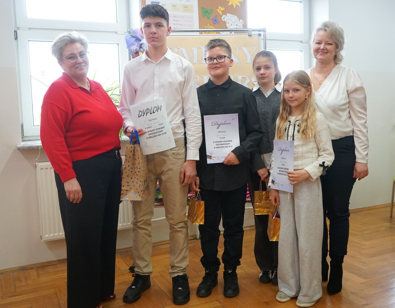 Aktualności 47 9-04-2026 W dobie powszechnego dostępu do Internetu, codziennego korzystania z komunikatorów, braku dbałości o stosowanie polskich znaków i zastępowania rodzimych słów zapożyczeniami na szczególne uznanie zasługują ci, którzy polszczyzny kaleczyć nie chcą. Właśnie tacy uczniowie zostali wyłonieni w Gminnym Konkursie Ortograficznym, który odbył się 9 kwietnia 2026 r. w Publicznej Szkole Podstawowej w Leszczynie po raz kolejny. Konkurs został przeprowadzony w dwóch kategoriach wiekowych: kat. kl. IV-VI i kat. kl. VII - VIII. Uczestnicy z poszczególnych grup wiekowych pisali dyktando konkursowe dostosowane do ich wiedzy i możliwości. Wzmaganiach konkursowych wzięło udział 20 uczniów. Każda szkoła mogła wytypować po dwóch uczestników w każdej kategorii. Prace konkursowe zostały sprawdzone wg ustalonych kryteriów oceniania i punktowania dyktanda ortograficznego przez nauczycieli polonistów.Celem konkursu było:podniesienie poziomu kompetencji ortograficznych uczniów,popularyzacja konkursu jako jednej z form rozwijania zainteresowań i uzdolnień,integracja uczniów,propagowanie kultury języka polskiego,wdrażanie do zdrowej rywalizacji,dbanie o systematyczną pracę nad poprawnością ortograficzną .W kategorii klas IV-VI przyznano następujące lokaty:I miejsce - Emilia Łącka SP w Łąkcie DolnejII miejsce -Maksymilian Ferenc SP w KamionnejIII miejsce -Aniela Mucha ZPO w TrzcianieW kategorii klas VII-VIII przyznano 5 miejsc pierwszych ex aequo :Milena Golonka SP w Łąkcie DolnejKarolina Opioła SP w KierlikówceDominika Gnyla SP w KamionnejWojciech Dziedzic PSP w LeszczynieHubert Ferenc SP w KamionnejNa zakończenie konkursu uczniowie otrzymali mały, słodki poczęstunek i wykonano pamiątkowe zdjęcia laureatów. Pożegnaliśmy się z nadzieją na kolejne spotkania konkursowe w naszej lub innych szkołach.Wszystkim uczestnikom dziękujemy za udział.Gratulujemy wyróżnionym i nagrodzonym w obu kategoriach wiekowych! 0.0 Ostatnia modyfikacja: czwartek 09 kwietnia 2026 15:44 Powiązane artykuły: Strażacka wiedza w praktyce – etap powiatowy OTWP 2026 Gminny Turniej Piłki Ręcznej chłopców klas 4-6 "Igrzyska Dzieci" 2026 I POWIATOWY KONKURS W UDZIELANIU PIERWSZEJ POMOCY PRZEDMEDYCZNEJ Wielkanoc 2026 - życzenia Nasze utalentowane laureatki Gminnego Konkursu Piosenki Anglojęzycznej „I can sing" Konkurs Recytatorski 2026 Apel Wielkanocny 2026 OGÓLNOPOLSKI STRAŻACKI KONKURS PLASTYCZNY 2026 Młodzi strażacy w akcji! Sukcesy w konkursie „Młodzież Zapobiega Pożarom" Igrzyska Młodzieży Gminny Turniej Piłki Ręcznej Chłopców 2026 0