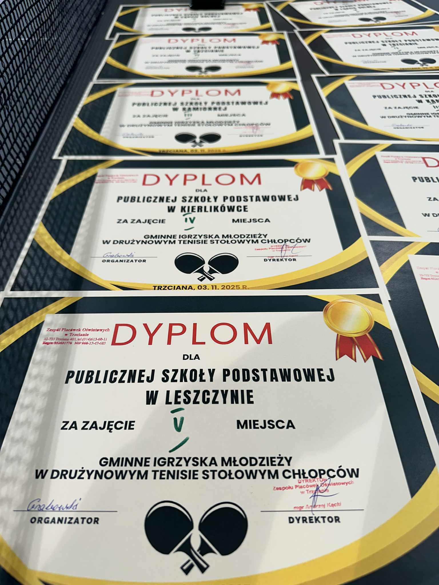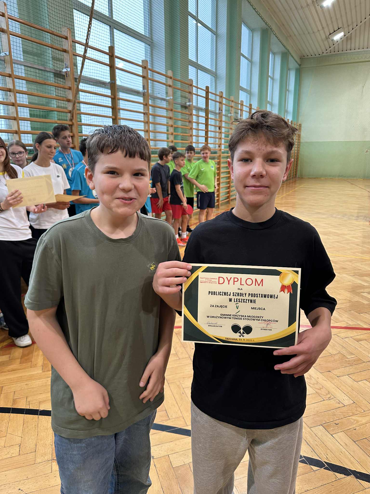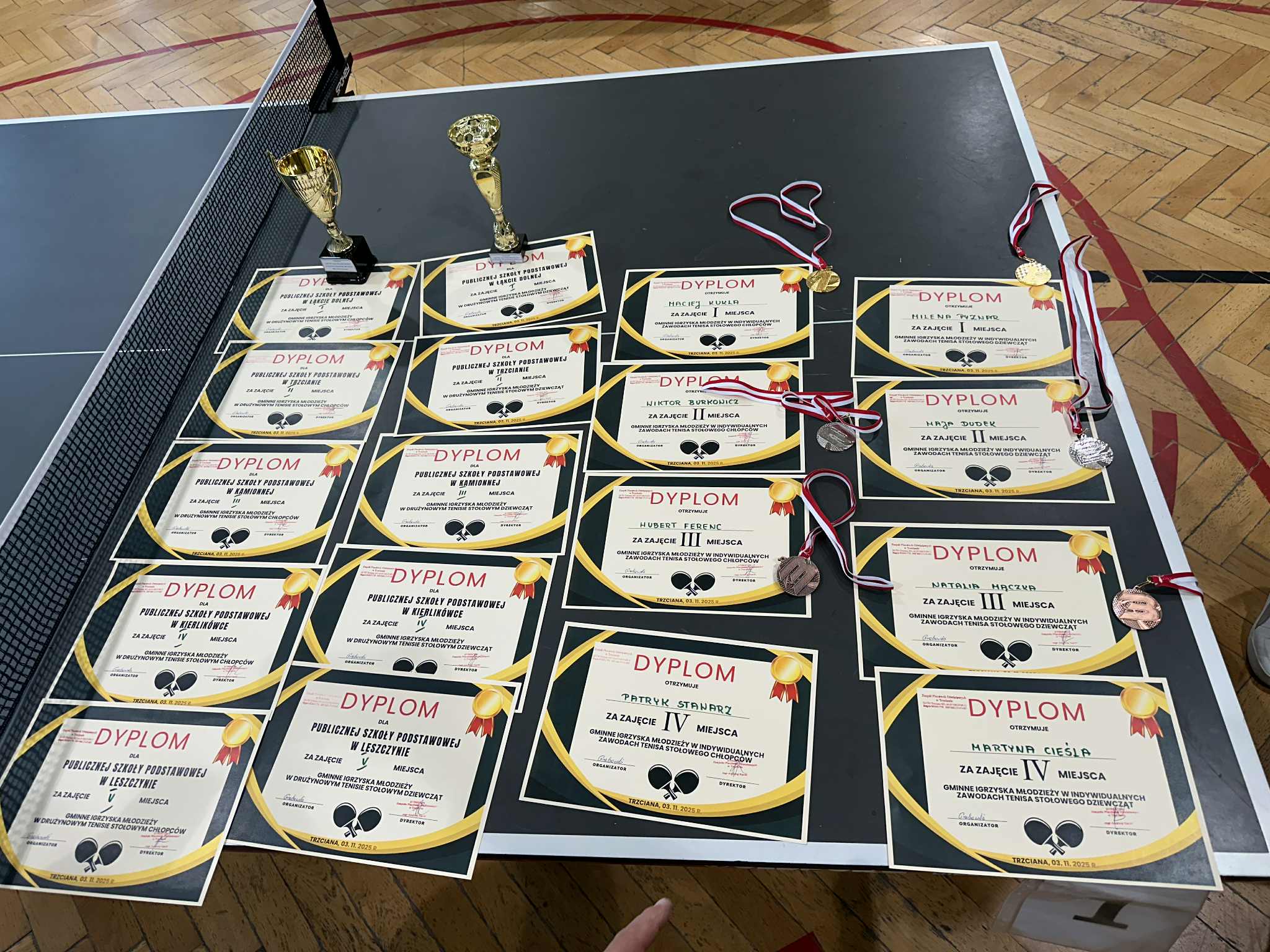 Aktualności 53 4-11-2025 3 listopada w naszej szkole odbył się Gminny Turniej Tenisa Stołowego, Igrzyska Młodzieży. W turnieju wzięły udział zawodniczki i zawodnicy klas 7-8 nie tylko naszej szkoły, ale również pozostałych szkół z terenu Gminy Trzciana ( Kamionna, Kierlikówka, Łąkta Dolna i Trzciana ). Docelowo reprezentanci naszej szkoły w klasyfikacji drużynowej zajęli piąte miejsce, zarówno dziewczęta jak i chłopcy. Indywidualnie nasza super reprezentantka Maja Dudek zajęła drugie miejsce indywidualnie w klasyfikacji dziewcząt i zakwalifikowała się do turnieju powiatowego, który się odbędzie 19 listopada 2025 roku w Rzezawie. Wielkie podziękowania dla uczniów, za godne reprezentowanie szkoły w Leszczynie. 0.0 Ostatnia modyfikacja: -/- Powiązane artykuły: Gminny Turniej Piłki Ręcznej chłopców klas 4-6 "Igrzyska Dzieci" 2026 Gminny Konkurs Ortograficzny 2026 Igrzyska Młodzieży Gminny Turniej Piłki Ręcznej Chłopców 2026 Gminny Turniej Tenisa Stołowego 2026 Udział w ogólnopolskiej akcji BohaterON - 2025/2026 Olimpiada Mitologiczna 2025 Wyniki konkursu Alfik Matematyczny 2025 Boże Narodzenie 2025 - życzenia Akcja charytatywna „Paczuszka dla Maluszka" 2025 Jasełka i Wigilia - 2025 0