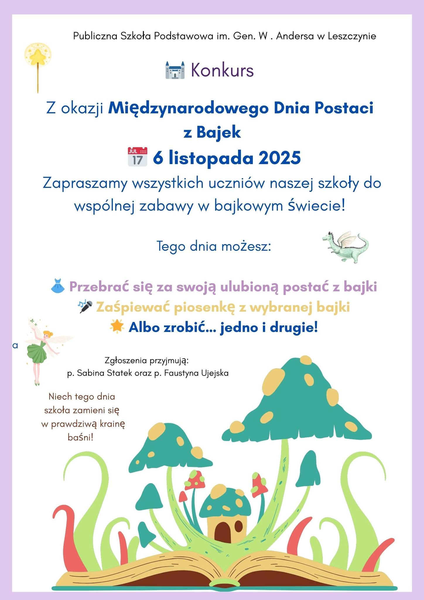 Aktualności 71 12-10-2025 Konkurs z okazji Międzynarodowego Dnia Postaci z Bajek 0.0 Ostatnia modyfikacja: niedziela 12 padziernika 2025 10:11 Powiązane artykuły: I POWIATOWY KONKURS W UDZIELANIU PIERWSZEJ POMOCY PRZEDMEDYCZNEJ Gminny Konkurs Ortograficzny 2026 Nasze utalentowane laureatki Gminnego Konkursu Piosenki Anglojęzycznej „I can sing" Konkurs Recytatorski 2026 OGÓLNOPOLSKI STRAŻACKI KONKURS PLASTYCZNY 2026 Młodzi strażacy w akcji! Sukcesy w konkursie „Młodzież Zapobiega Pożarom" Wyniki konkursu Alfik Matematyczny 2025 III GMINNY KONKURS PLASTYCZNY – NAJPIĘKNIEJSZE DRZEWKO BOŻONARODZENIOWE XVIII Gminny konkurs językowo-ortograficzny Z polszczyzną na co dzień Rozstrzygnięcie konkursu plastycznego „BAJKOWA ZIMA" 0