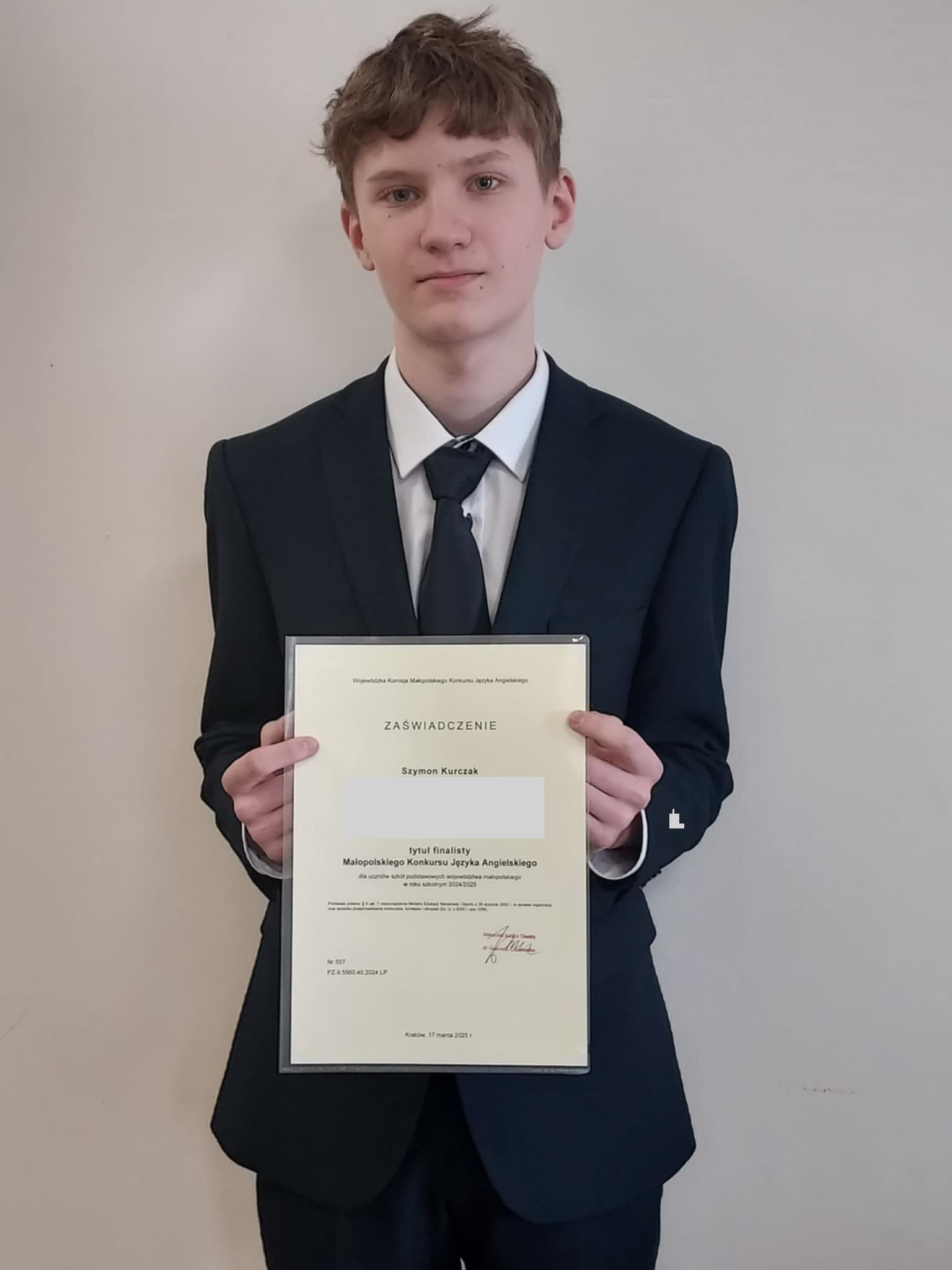 Aktualności 338 14-05-2025 Z radością informujemy, że udział ucznia klasy VIII Szymona Kurczaka w lutym br. w Tarnowie w etapie wojewódzkim Małopolskiego Konkursu Języka Angielskiego dla szkół podstawowych został zwieńczony uzyskaniem tytułem FINALISTY, co jest ogromnym osiągnięciem, które świadczy o wysokim poziomie znajomości języka oraz ciężkiej pracy włożonej w naukę. To sukces, który nie tylko daje satysfakcję, ale również otwiera nowe możliwości, takie jak dodatkowe punkty rekrutacyjne do szkół średnich czy prestiżowe wyróżnienie oraz możliwość otrzymania stypendium naukowego. W tym tygodniu Szymon otrzymał oficjalne zaświadczenie Małopolskiego Kuratora Oświaty potwierdzające uzyskany tytuł. Finaliści konkursu musieli wykazać się wszechstronną znajomością języka angielskiego, obejmującą gramatykę, słownictwo, rozumienie tekstu, a także umiejętność analizy i znajomość kultury i historii krajów anglojęzycznych. Determinacja oraz zaangażowanie Szymona były kluczowe na każdym etapie rywalizacji włączając etap szkolny (październik 2024 r.), rejonowy (grudzień 2024 r.) oraz wojewódzki (luty br.). Zdobycie tego tytułu to nie tylko dowód na zdolności językowe (treści obejmują wiedzę na poziomie matury rozszerzonej z języka angielskiego – poziom B2 oraz matury dwujęzycznej – poziom C1), ale także na systematyczność, wytrwałość i pasję do nauki. Gratulacje dla Szymona i rodziców za wspieranie talentu syna i motywowanie go do rozwijania wybitnych kompetencji językowych! 0.0 Ostatnia modyfikacja: -/- Powiązane artykuły: Nasze utalentowane laureatki Gminnego Konkursu Piosenki Anglojęzycznej „I can sing" Wyniki konkursu Alfik Matematyczny 2025 Rozstrzygnięcie konkursu plastycznego „BAJKOWA ZIMA" Mama i Tata najpiękniejsze słowa świata - Dzień Mamy i Taty 2025 Wyniki konkursu "Świetlik" 2025 Muzyczna magia języka angielskiego – Gminny Konkurs Piosenki pełen talentów! Wyniki konkursu "Kangur Matematyczny" 2025 Szkolne eliminacje Konkursu Piosenki Angielskiej Wyniki konkursu „Logiczne myślenie" 2025 Rozstrzygnięcie konkursu plastycznego "Plastuś" 0