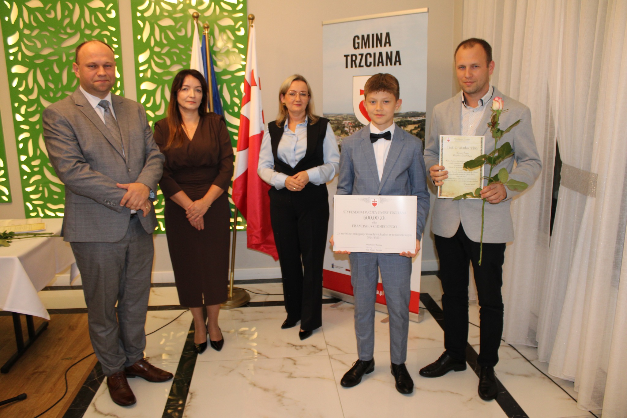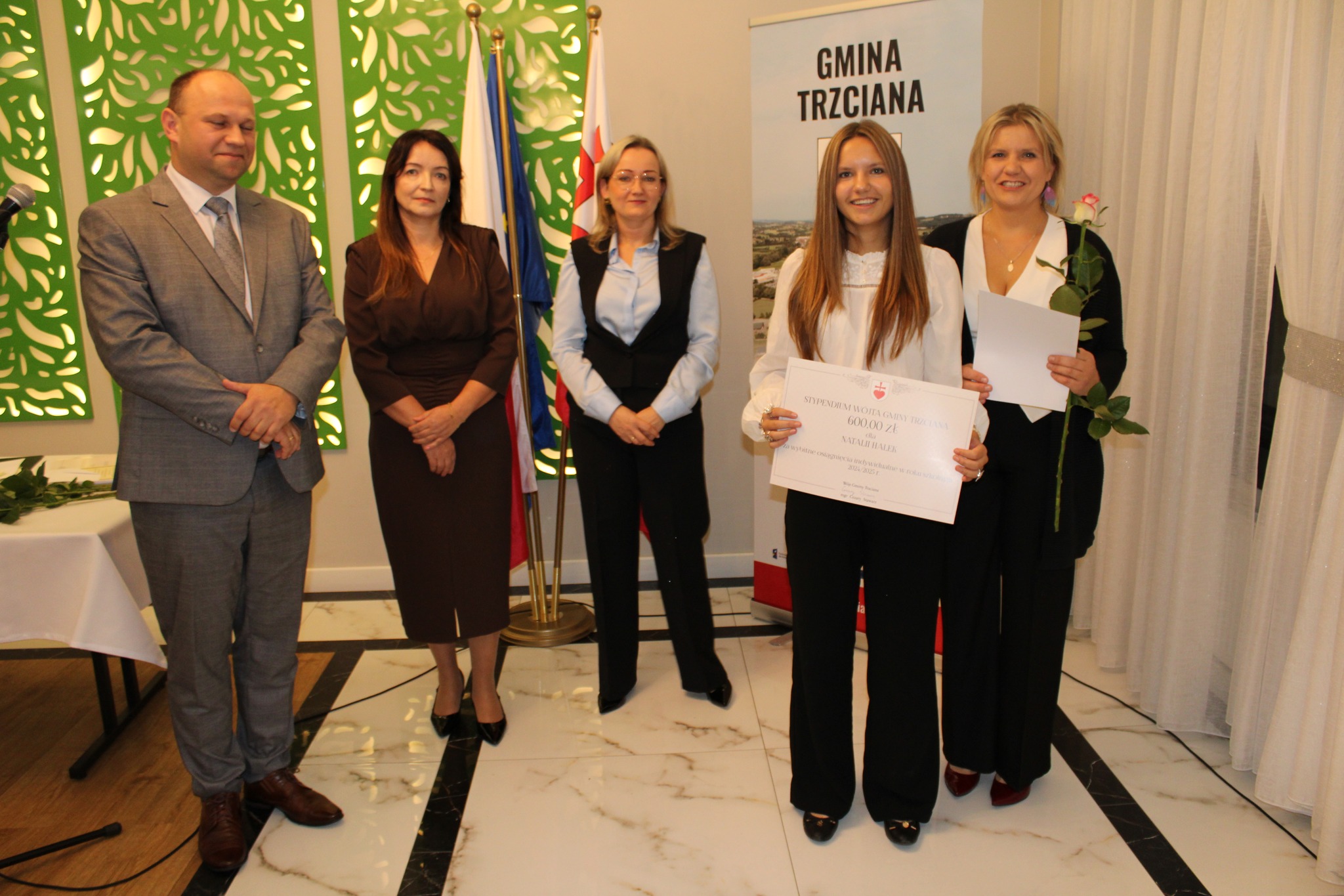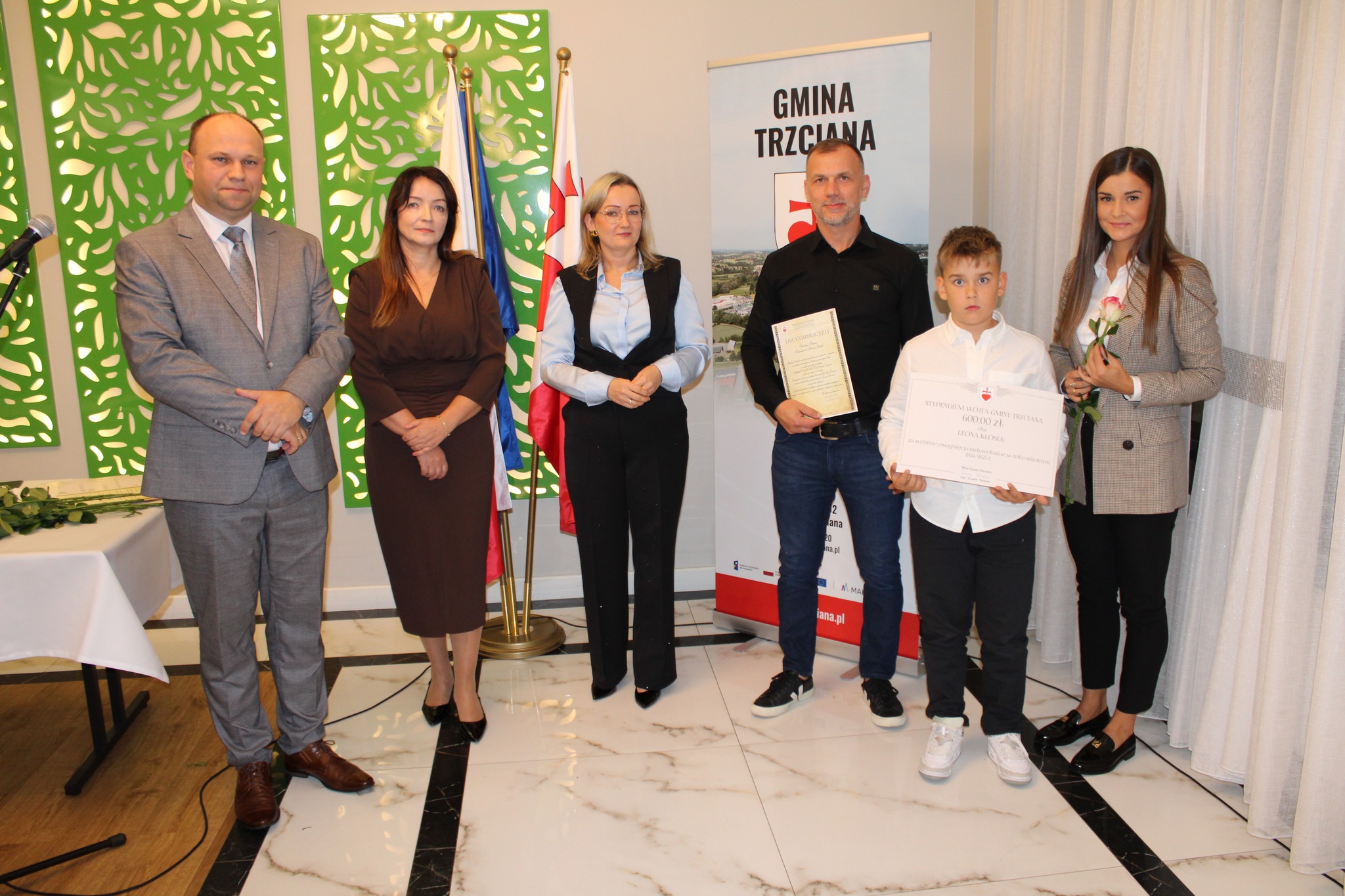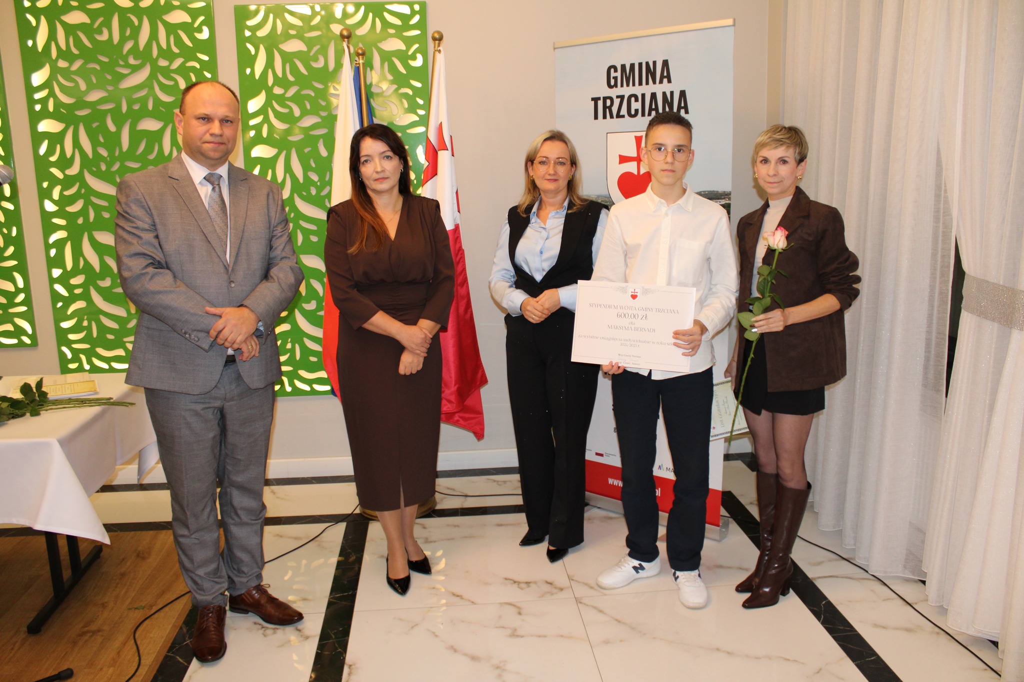 Aktualności 141 15-10-2025 W dniu 7 października 2025 r. odbyła się uroczystość na której Wójt Gminy Trzciana Cezary Stawarz wręczył uczniom symboliczne czeki potwierdzające przyznanie ,,Stypendium Wójta Gminy Trzciana’’. Razem z Kierownikiem GZOS w Trzcianie Panią Beatą Mordarską oraz Zastępcą Kierownika RISKiR Panią Karoliną Madej-Kaczmarczyk, na podstawie decyzji Komisji Stypendialnej wręczył 41 nagród Wójta Gminy Trzciana. Nagrodzeni zostali uczniowie w kategorii: za wybitne wyniki w nauce - 32 stypendia, za osiągnięcia indywidualne - artystyczne - 4 stypendia oraz za osiągnięcia indywidualne - artystyczne - 5 stypendiów. Stypendia Wójta Gminy Trzciana przyznawane są zgodnie z Uchwałą Nr XL/374/23 Rady Gminy Trzciana z dnia 30 czerwca 2023 r. Zamierzeniem przyjętego programu wspierania edukacji uzdolnionych uczniów jest motywowanie i nagradzanie uczniów oraz promowanie pozytywnych wzorców wśród społeczności uczniowskiej, a także w środowisku lokalnym. Przeznaczono na ten cel 26 500,00 złotych. Stypendium Wójta Gminy Trzciana w kategorii ,, za wybitne osiągnięcia indywidualne - naukowe ’’ otrzymał: Szymon Kurczak - uczeń PSP im. Gen. Władysława Andersa w Leszczynie, Stypendium Wójta Gminy Trzciana w kategorii ,, za wybitne wyniki w nauce” otrzymali: uczniowie Publicznej Szkoły Podstawowej im. Gen. Władysława Andersa w Leszczynie, kierowanej przez Dyrektora szkoły Panią mgr Annę Dziedzic - Maksym Bernady, - Franciszek Chojecki, - Natalia Halek, - Leon Kłósek, - Łucja Motak, - Radosław Zdebski. Z ogromną radością i dumą składamy serdeczne gratulacje wszystkim Stypendystom. Wasze osiągnięcia oraz zaangażowanie są dowodem na to że pasja, ciężka praca i wytrwałość prowadzą do sukcesu. Uzyskane wyniki są powodem do dumy. Wasza postawa jest inspiracją, a otrzymane wyróżnienie to również mobilizacja do dalszego rozwoju. Życzymy Wam dalszych sukcesów, motywacji oraz wielu okazji do realizacji swoich marzeń. Brawo! Jesteśmy z Was dumni. 0.0 Ostatnia modyfikacja: -/- Powiązane artykuły: Udział w ogólnopolskiej akcji BohaterON - 2025/2026 Olimpiada Mitologiczna 2025 Wyniki konkursu Alfik Matematyczny 2025 Boże Narodzenie 2025 - życzenia Akcja charytatywna „Paczuszka dla Maluszka" 2025 Jasełka i Wigilia - 2025 „Mała książka – wielki człowiek" - 2025 Spotkanie z podróżnikiem - Indie 2025 Paczuszka dla Maluszka - 2025 OTRZĘSINY KLASY 4 I ZABAWA ANDRZEJKOWA – 26.11.2025r. 0