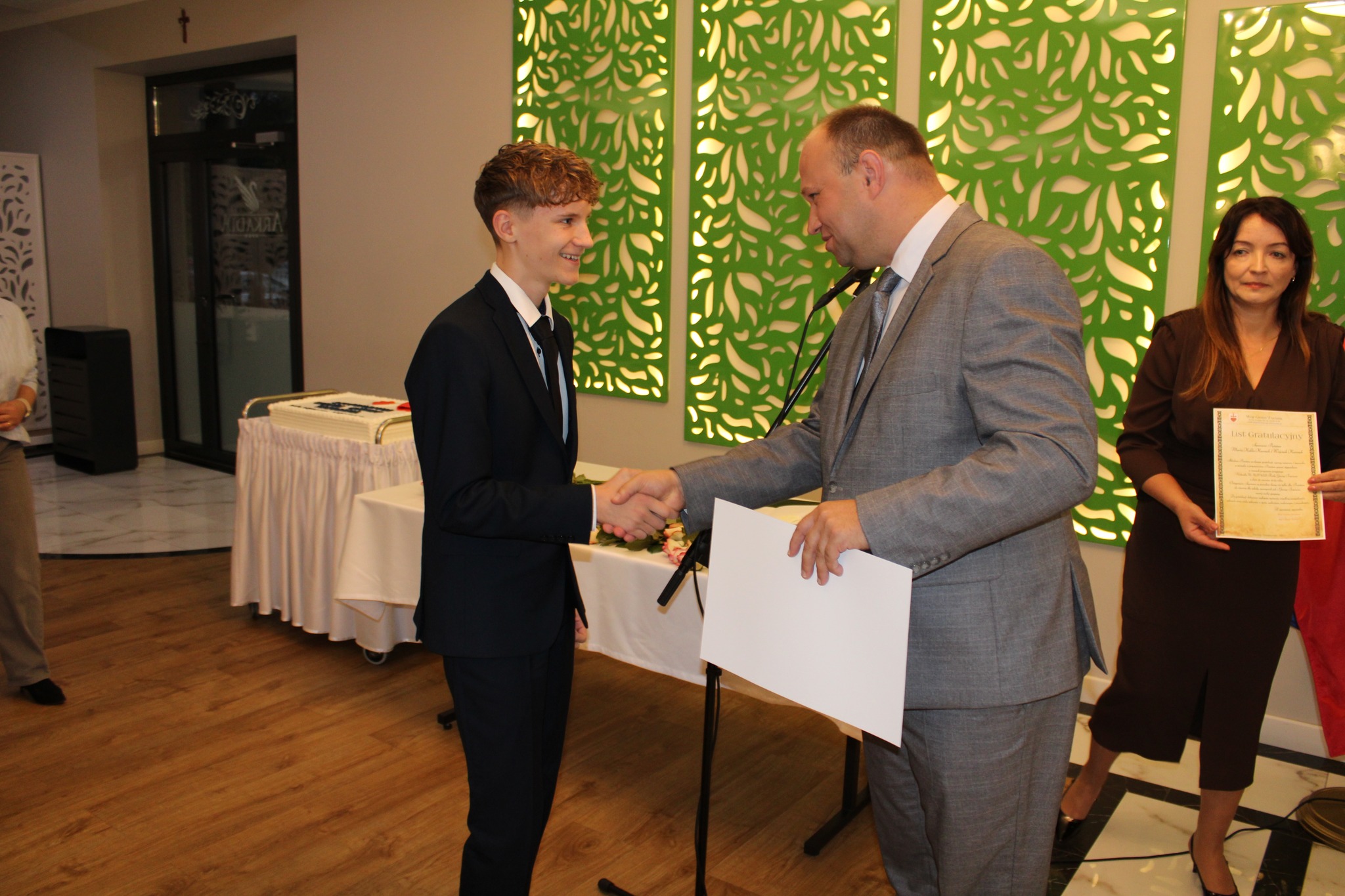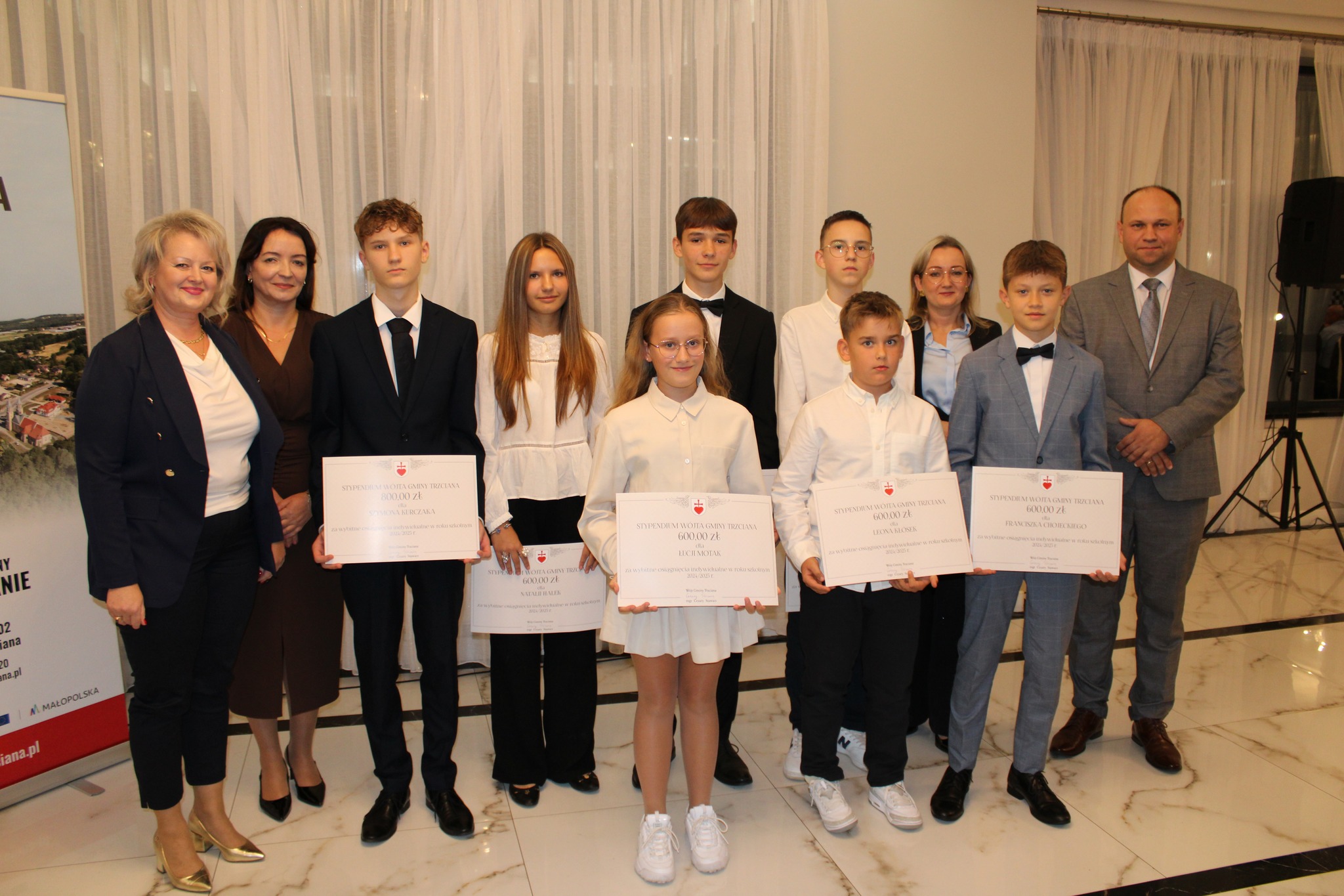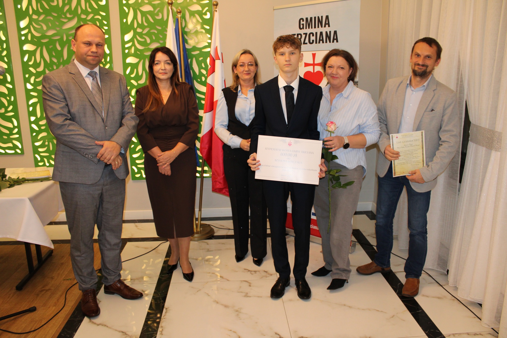 Aktualności 141 15-10-2025 W dniu 7 października 2025 r. odbyła się uroczystość na której Wójt Gminy Trzciana Cezary Stawarz wręczył uczniom symboliczne czeki potwierdzające przyznanie ,,Stypendium Wójta Gminy Trzciana’’. Razem z Kierownikiem GZOS w Trzcianie Panią Beatą Mordarską oraz Zastępcą Kierownika RISKiR Panią Karoliną Madej-Kaczmarczyk, na podstawie decyzji Komisji Stypendialnej wręczył 41 nagród Wójta Gminy Trzciana. Nagrodzeni zostali uczniowie w kategorii: za wybitne wyniki w nauce - 32 stypendia, za osiągnięcia indywidualne - artystyczne - 4 stypendia oraz za osiągnięcia indywidualne - artystyczne - 5 stypendiów. Stypendia Wójta Gminy Trzciana przyznawane są zgodnie z Uchwałą Nr XL/374/23 Rady Gminy Trzciana z dnia 30 czerwca 2023 r. Zamierzeniem przyjętego programu wspierania edukacji uzdolnionych uczniów jest motywowanie i nagradzanie uczniów oraz promowanie pozytywnych wzorców wśród społeczności uczniowskiej, a także w środowisku lokalnym. Przeznaczono na ten cel 26 500,00 złotych. Stypendium Wójta Gminy Trzciana w kategorii ,, za wybitne osiągnięcia indywidualne - naukowe ’’ otrzymał: Szymon Kurczak - uczeń PSP im. Gen. Władysława Andersa w Leszczynie, Stypendium Wójta Gminy Trzciana w kategorii ,, za wybitne wyniki w nauce” otrzymali: uczniowie Publicznej Szkoły Podstawowej im. Gen. Władysława Andersa w Leszczynie, kierowanej przez Dyrektora szkoły Panią mgr Annę Dziedzic - Maksym Bernady, - Franciszek Chojecki, - Natalia Halek, - Leon Kłósek, - Łucja Motak, - Radosław Zdebski. Z ogromną radością i dumą składamy serdeczne gratulacje wszystkim Stypendystom. Wasze osiągnięcia oraz zaangażowanie są dowodem na to że pasja, ciężka praca i wytrwałość prowadzą do sukcesu. Uzyskane wyniki są powodem do dumy. Wasza postawa jest inspiracją, a otrzymane wyróżnienie to również mobilizacja do dalszego rozwoju. Życzymy Wam dalszych sukcesów, motywacji oraz wielu okazji do realizacji swoich marzeń. Brawo! Jesteśmy z Was dumni. 0.0 Ostatnia modyfikacja: -/- Powiązane artykuły: Udział w ogólnopolskiej akcji BohaterON - 2025/2026 Olimpiada Mitologiczna 2025 Wyniki konkursu Alfik Matematyczny 2025 Boże Narodzenie 2025 - życzenia Akcja charytatywna „Paczuszka dla Maluszka" 2025 Jasełka i Wigilia - 2025 „Mała książka – wielki człowiek" - 2025 Spotkanie z podróżnikiem - Indie 2025 Paczuszka dla Maluszka - 2025 OTRZĘSINY KLASY 4 I ZABAWA ANDRZEJKOWA – 26.11.2025r. 0