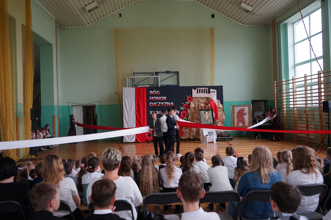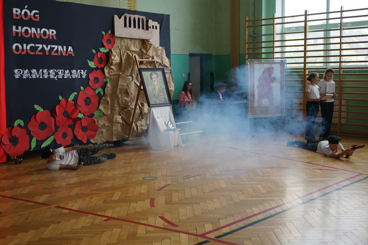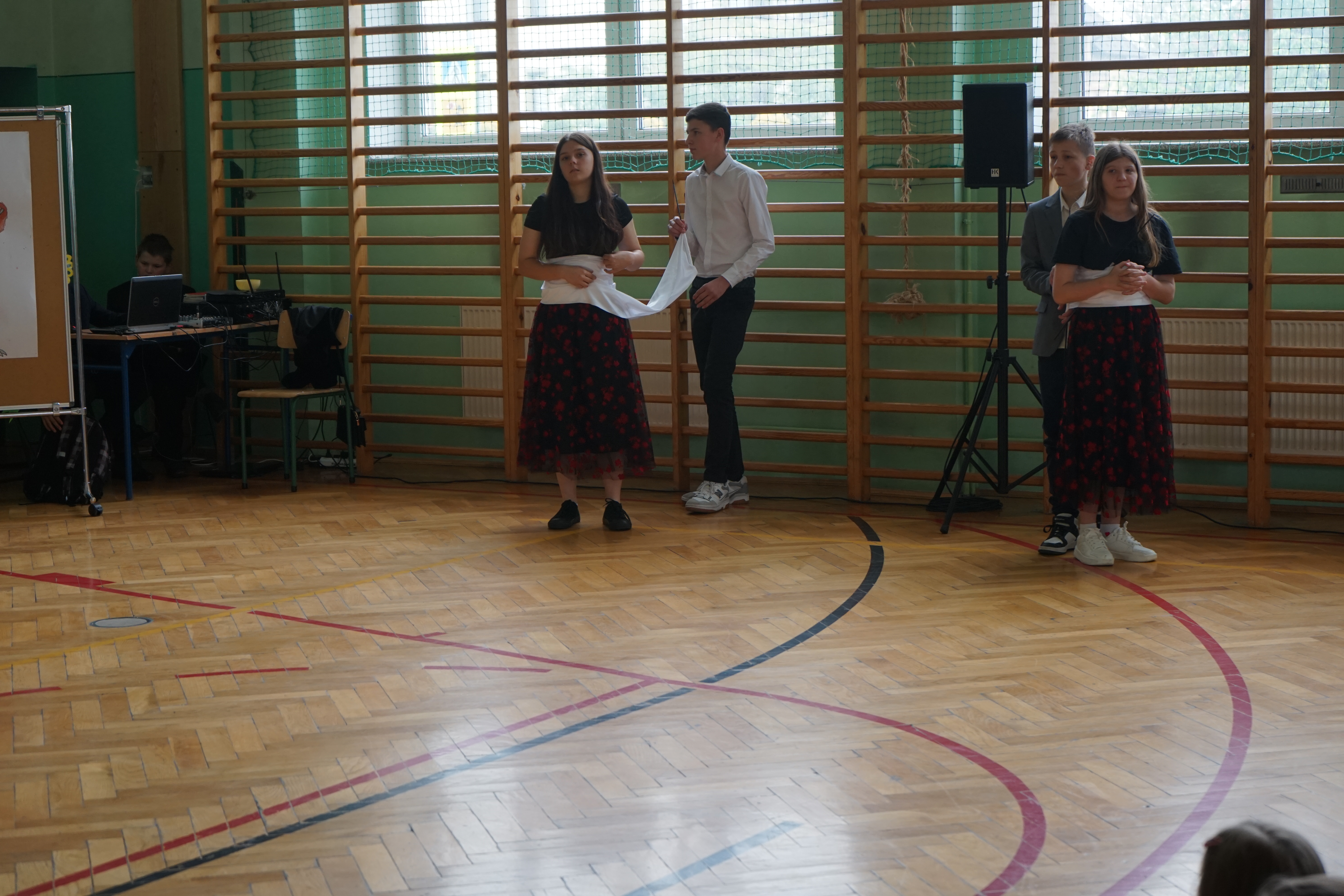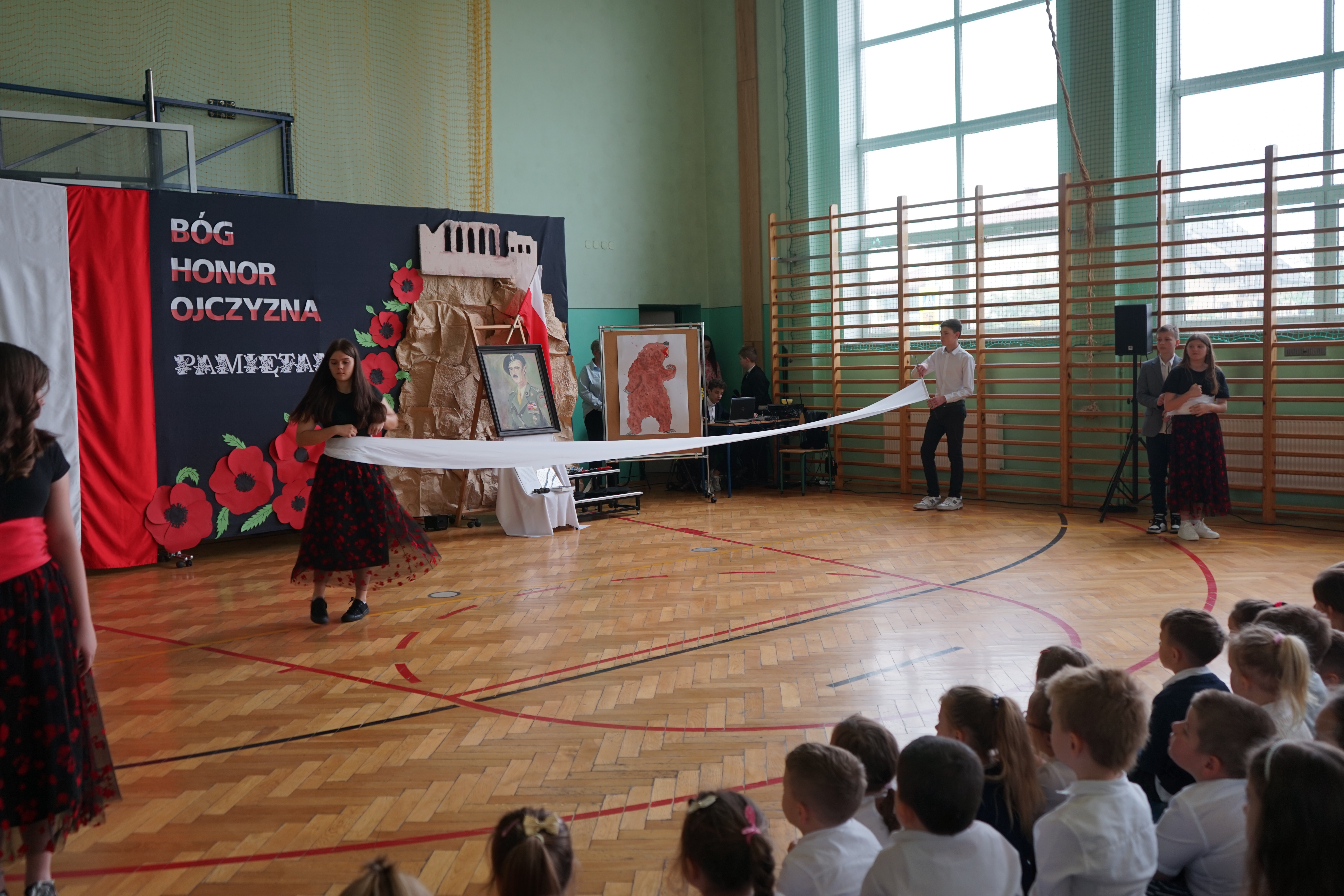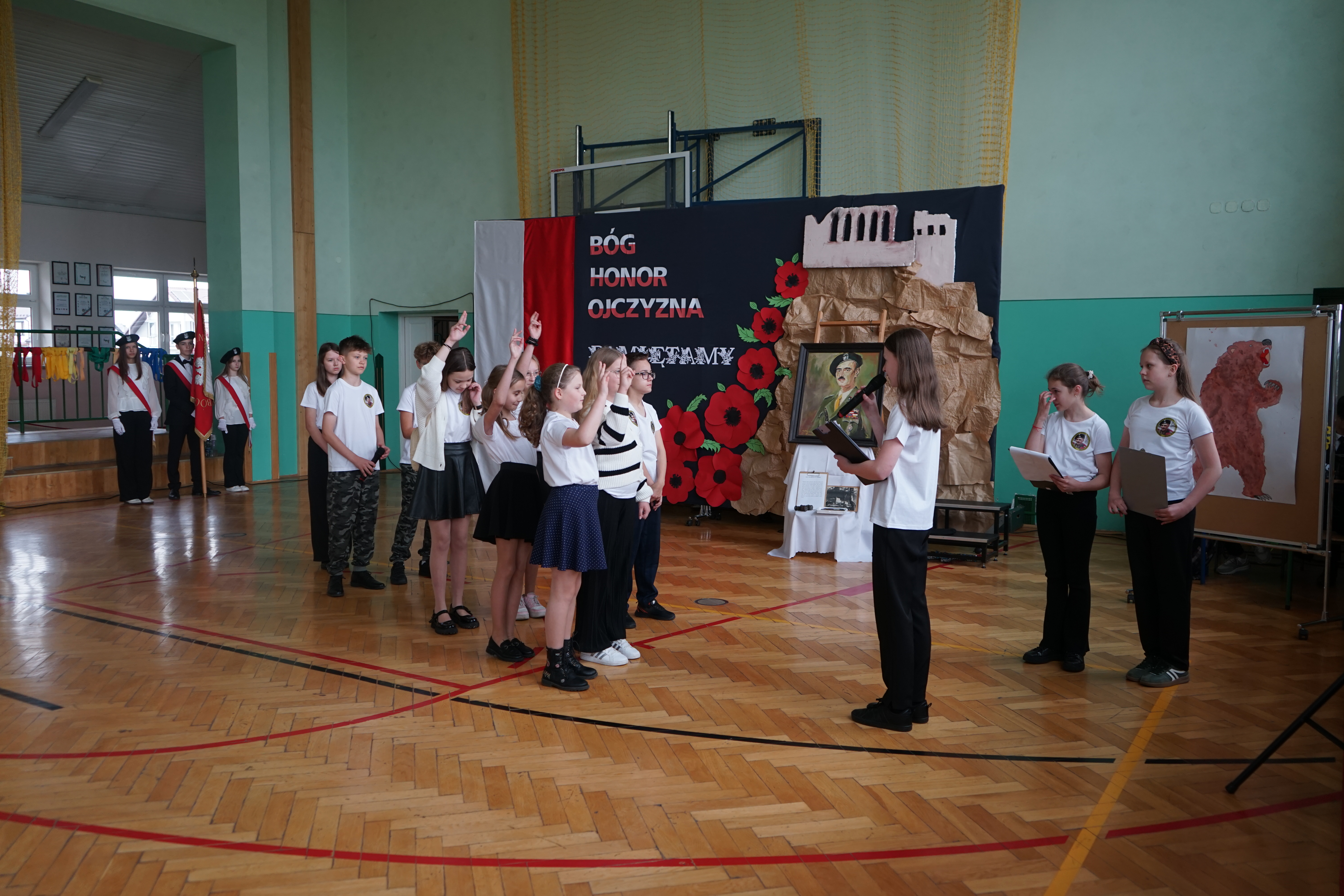 Aktualności 188 20-05-2025 20.05.2025 r. obchodziliśmy w naszej szkole Święto Patrona Szkoły - gen. Władysława Andersa. O godz. 8.15 udaliśmy się do kościoła parafialnego, aby uczestniczyć w uroczystej mszy św., podczas której modliliśmy się za całą społeczność szkolną, powodzenie w nauce i pracy oraz za duszę patrona i żołnierzy, którzy walczyli za wolność naszej ojczyzny. Ksiądz Proboszcz w słowie skierowanym do wszystkich zebranych uświadomił nam, kim jest bohater we współczesnym świecie, co to znaczy być dobrym uczniem, patriotą; zwrócił uwagę na najważniejsze wartości, podkreślając, że prawdziwa miłość Boga jest fundamentem miłości do drugiego człowieka i do ojczyzny. Po powrocie do szkoły nauczyciele oraz uczniowie odśpiewali hymn państwowy, a następnie złożono wiązankę pod tablicą upamiętniającą gen. Władysława Andersa. Następnie w sali gimnastycznej odbyła się uroczysta akademia, poświęcona generałowi Andersowi- dowódcy Armii Polskiej na Wschodzie w czasie II wojny światowej i żołnierzom II Korpusu. Przy tej okazji warto wspomnieć, że 12 maja minęła 55 rocznica śmierci generała, a 18 maja obchodzono 81 rocznicę zdobycia Monte Cassino. Tym razem uczniowie klasy 5 wcielili się w rolę uczestników wycieczki po muzeum II wojny światowej, gdzie spotkała ich niesamowita przygoda. Magiczne berety przeniosły ich do 1944 roku, do klasztornego wzgórza. Tam, początkowo pilnując niedźwiedzia Wojtka, stali się uczestnikami słynnej bitwy o Monte Cassino i bohaterami pomagającymi jednemu z żołnierzy wbić polską flagę na szczycie klasztoru. Wszyscy z wielką dumą odśpiewali hymn naszej szkoły czyli najsłynniejszą pieśń z okresu II wojny światowej – „Czerwone maki na Monte Cassino". Chwile niezwykłego wzruszenia i zadumy zapewnili nam uczniowie klasy 7, którzy wykonali piękny taniec patriotyczny oraz pieśń „ O Panie, któryś jest na niebie” w wykonaniu naszej solistki Malwiny Chojeckiej. Po zakończeniu akademii głos zabrała pani Dyrektor Anna Dziedzic, która podkreśliła, że ten dzień jest dla nas najważniejszym dniem w życiu szkoły oraz okazją do upamiętnienia znaczenia i wkładu generała w historię Polski. Życzyła wszystkim, aby w życiu kierować się wartościami, w które mocno wierzył gen. Anders , bo wiara i ufność Bogu, życie zgodne z zasadami, czyste sumienie i miłość do ojczyzny, w tym do naszej „ małej ojczyzny – Leszczyny” to droga do dobrego życia, do dokonywania odpowiednich wyborów, do pokonywania trudności i realizacji zamierzonych celów. Jest to również sposobność do integracji społeczności szkolnej oraz do budowania więzi między uczniami, nauczycielami i pracownikami szkoły poprzez wspólne obchody i celebrację życia i dokonań patrona. Po części oficjalnej uczniowie udali się wraz z wychowawcami do klas, gdzie zorganizowano maraton filmowy. 0.0 Ostatnia modyfikacja: -/- Powiązane artykuły: Udział w ogólnopolskiej akcji BohaterON - 2025/2026 Olimpiada Mitologiczna 2025 Wyniki konkursu Alfik Matematyczny 2025 Boże Narodzenie 2025 - życzenia Akcja charytatywna „Paczuszka dla Maluszka" 2025 Jasełka i Wigilia - 2025 „Mała książka – wielki człowiek" - 2025 Spotkanie z podróżnikiem - Indie 2025 Paczuszka dla Maluszka - 2025 OTRZĘSINY KLASY 4 I ZABAWA ANDRZEJKOWA – 26.11.2025r. 0