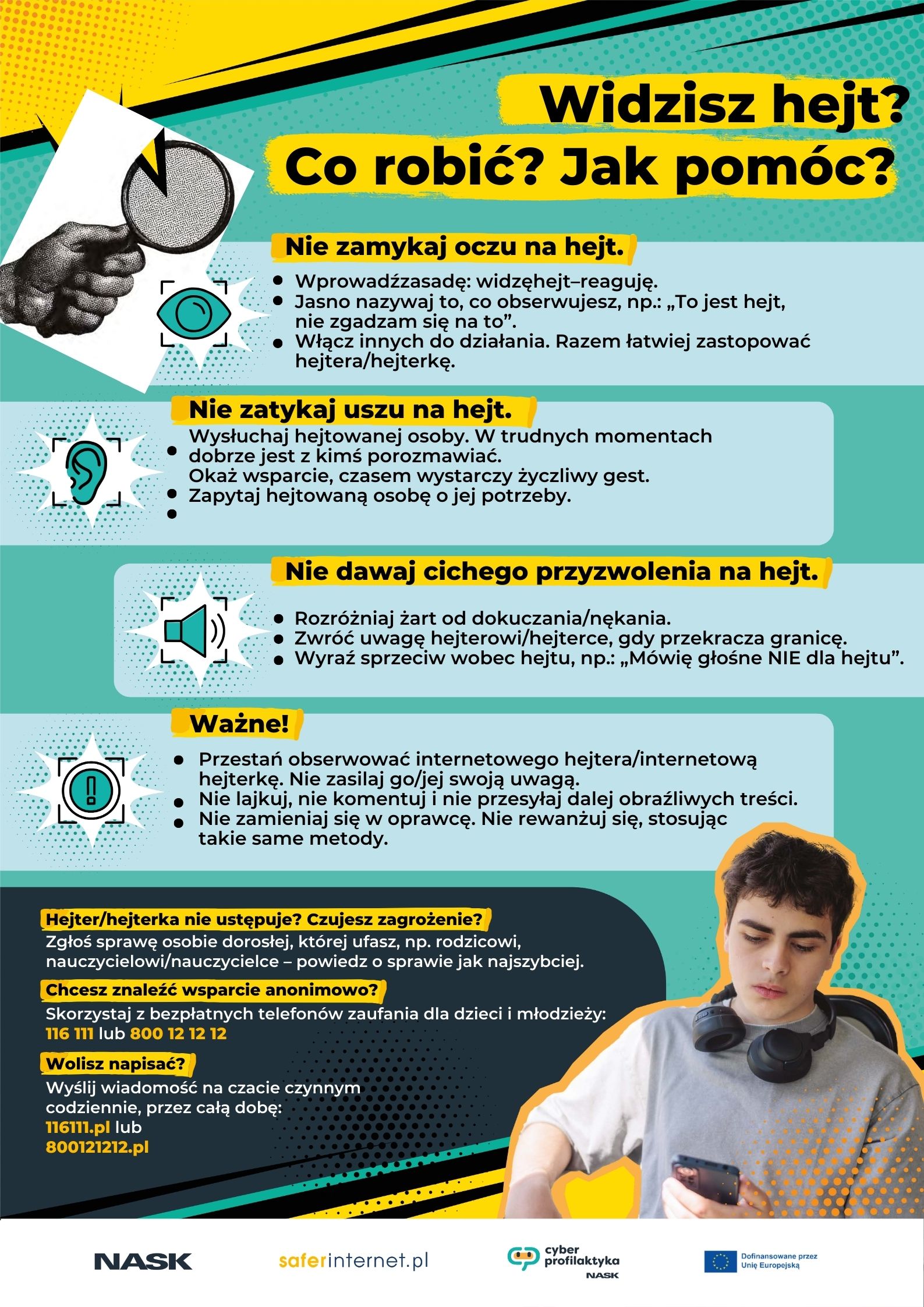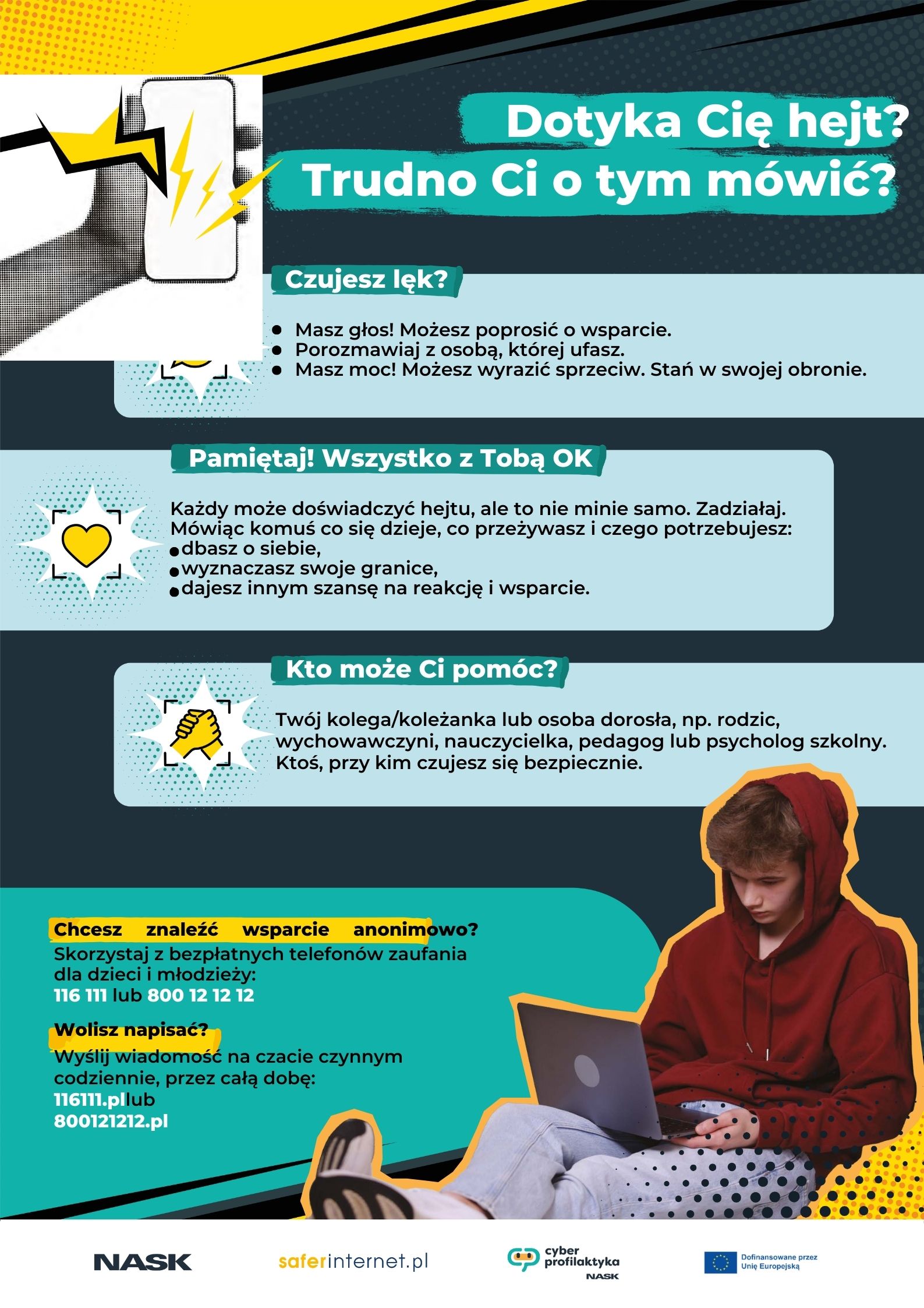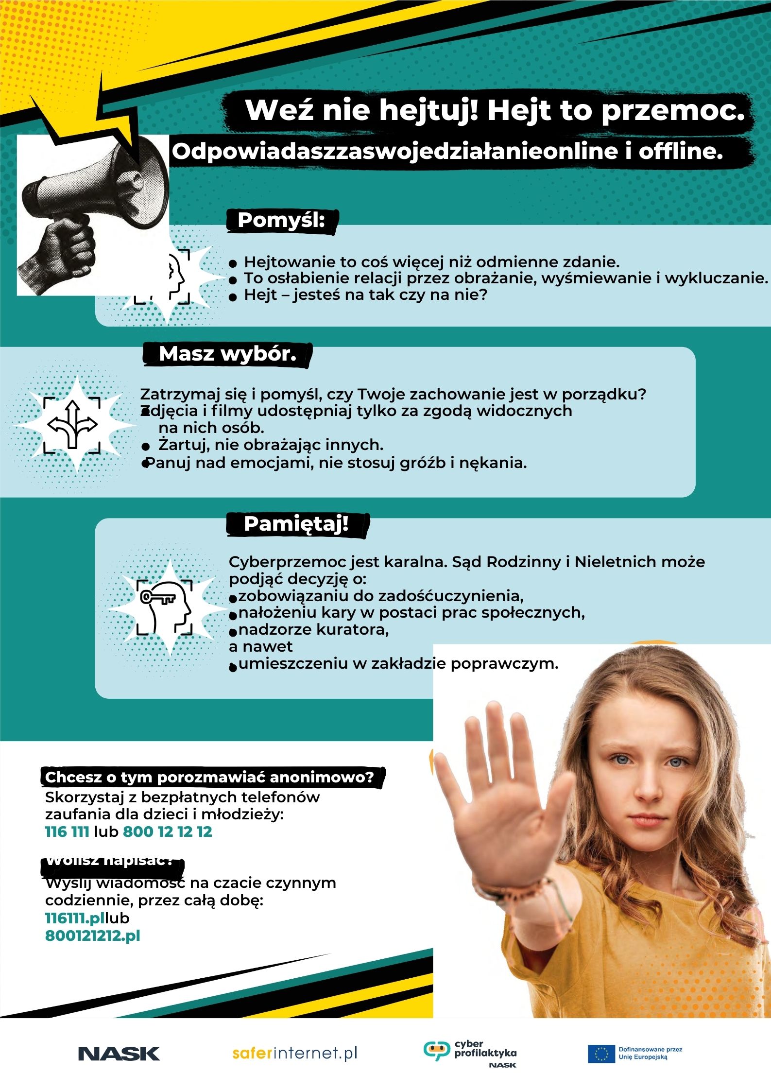 Aktualności 97 29-09-2025 W dniach 29.09 – 03.10 obchodzimy w naszej szkole Tydzień o Przeciwdziałaniu Przemocy. To ważna inicjatywa, której celem jest zwrócenie uwagi na budowanie relacji opartych na szacunku, empatii i bezpieczeństwie. Chcemy pokazać, że przemocy można przeciwdziałać – zaczynając od najmłodszych lat. Dlatego w tym czasie: z młodszymi dziećmi będziemy rozmawiać i bawić się przy pomocy symboli szakala i żyrafy, które uczą, jak mówić o emocjach i potrzebach w sposób bezpieczny, starsi uczniowie wezmą udział w warsztatach z psychologiem i pedagogiem, podczas których wspólnie poszukają sposobów rozwiązywania konfliktów bez przemocy. Zachęcamy również Państwa do zapoznania się z materiałami edukacyjnymi, które dołączamy do tego posta. Wierzymy, że rozmowa i refleksja w domu to równie ważny krok ku budowaniu postawy wolnej od przemocy. ŚCIEŻKA POMOCY PRZEMOC RÓWIEŚNICZA W SZKOLE Ø RODZIC Jeśli wiesz, że Twoje dziecko może doświadczać przemocy rówieśniczej - reaguj. Poniżej znajdziesz wskazówki i informacje co zrobić, żeby pomóc swojemu dziecku. Co musisz zrobić: · Porozmawiaj ze swoim dzieckiem — zachowaj spokój, unikaj krytyki i oceniania, okaż wsparcie i zrozumienie. · Zadbaj o przyjazne, bezpieczne otoczenie rozmowy. · Podczas rozmowy poproś o opisanie sytuacji w tym zapytaj o konkretne informacje na temat zdarzenia: kto, kiedy, co się stało, jak często. · Zanotuj istotne szczegóły zdarzenia (datę, miejsce, osoby, które brały czynny i bierny udział, nazwij formę przemocy np. fizyczna, psychiczna, cyberprzemoc). · Zastosuj parafrazę w celu upewnienia się, że dobrze zrozumiałeś opisane przez dziecko okoliczności zdarzenia, np. „Czy dobrze rozumiem, że…”. Używaj wyrażeń: „rozumiem, że jest Ci ciężko”, „dziękuję, że dzielisz się tym ze mną” Tego nie rób: · Nie bagatelizuj problemu. Zwróć uwagę, że sytuacja, która w Twojej opinii wygląda na mało istotną, dla Twojego dziecka może stanowić największy problem. · Nie sugeruj dziecku konfrontacji ze sprawcą/sprawcami. Unikaj wyrażeń.: „to tylko kłótnia”, „nie przejmuj się”, „to nie jest ważny problem”, „jak ja byłem/byłam młoda/młody to…” Gdy już pierwszą rozmowę masz za sobą, następnym krokiem, który musisz podjąć to skontaktowanie się ze szkołą i przedstawienie sytuacji: · wychowawcy klasy · pedagogowi/psychologowi szkolnemu · dyrektorowi szkoły (jeśli sytuacja jest poważna lub występuje brak reakcji ze strony kadry pedagogicznej) Co należy zrobić – krok po kroku: · Umów się na spotkanie z ww. osobami (telefonicznie lub mailowo). · Przedstaw informacje na temat incydentów - koncentrując się na faktach, unikając silnych emocji, starając się zachować spokojny ton wypowiedzi. · Poproś o podjęcie działań – szkoła ma obowiązek zareagować. Zgodnie z ustawą z 14 grudnia 2016 r. – Prawo oświatowe dyrektor szkoły odpowiada za zapewnienie bezpiecznych i higienicznych warunków nauki, wychowania i opieki. Możesz też zwrócić się o: · Informację, na temat podjętych przez szkołę działań w celu rozwiązania problemu przemocy rówieśniczej. · Zapewnienie dodatkowych środków bezpieczeństwa uczniowi/uczennicy i bieżące monitorowanie sytuacji w szkole. · W razie konieczności ustalenie planu pomocy psychologiczno-pedagogicznej. Monitoruj sytuację! Pozostań w stałym kontakcie ze szkołą – pozyskaj informacje o efektach podjętych działań. Dyskretnie obserwuj dziecko — jego zachowanie, samopoczucie, rozmawiaj o relacjach w klasie. Gdzie możesz poprosić o dodatkowe wsparcie dla dziecka? W razie konieczności możesz skorzystać z pomocy systemu opieki zdrowotnej: Ø Zespołów i Ośrodków Środowiskowej Pomocy Psychologicznej i Psychoterapeutycznej dla Dzieci i Młodzieży - I poziom referencyjny. W przypadku występowania niepokojących objawów związanych z problemami psychicznymi możesz skorzystać ze świadczeń w zakresie Zespołu lub Ośrodka środowiskowej opieki psychologicznej i psychoterapeutycznej dla dzieci i młodzieży. Świadczenia przeznaczone są dla dzieci oraz młodzieży do 21 r.ż. kształcącej się w szkołach ponadpodstawowych do ich ukończenia (z zastrzeżeniem, że osoby poniżej 18 r.ż. muszą posiadać zgodę opiekuna prawnego na korzystanie ze świadczeń). W zespole lub ośrodku możesz skorzystać z następujących świadczeń: porada psychologiczna diagnostyczna porada psychologiczna sesja psychoterapii indywidualnej sesja psychoterapii rodzinnej sesja psychoterapii grupowej sesja wsparcia psychospołecznego wizyta, porada domowa lub środowiskowa wizyta osoby prowadzącej terapię środowiskową. Świadczenia realizowane są przez zespół specjalistów: psychologa, psychoterapeutę oraz terapeutę środowiskowego. Opieka w ramach I poziomu referencyjnego oparta jest przede wszystkim na realizacji świadczeń w środowisku. Z tego powodu zalecany jest wybór placówki jak najbliżej miejsca zamieszkania. Do świadczeń realizowanych w zakresie I poziomu referencyjnego skierowanie NIE JEST WYMAGANE. Ø Centrów Zdrowia Psychicznego - II poziom referencyjny. W przypadku potrzeby uzyskania porady lekarza psychiatry możesz skierować się do: Centrum Zdrowia Psychicznego dla Dzieci i Młodzieży - poradnia zdrowia psychicznego - w którym w ramach poradni zdrowia psychicznego dla dzieci, realizowane są świadczenia ambulatoryjne przez lekarzy psychiatrów, psychologów oraz psychoterapeutów; Centrum Zdrowia Psychicznego dla Dzieci i Młodzieży – w którym w ramach poradni zdrowia psychicznego dla dzieci i na Oddziale dziennym psychiatrycznym rehabilitacyjnym dla dzieci, realizowane są odpowiednio świadczenia ambulatoryjne i dzienne przez lekarzy psychiatrów, psychologów, psychoterapeutów, terapeutów zajęciowych. Do świadczeń realizowanych w poradni zdrowia psychiczn