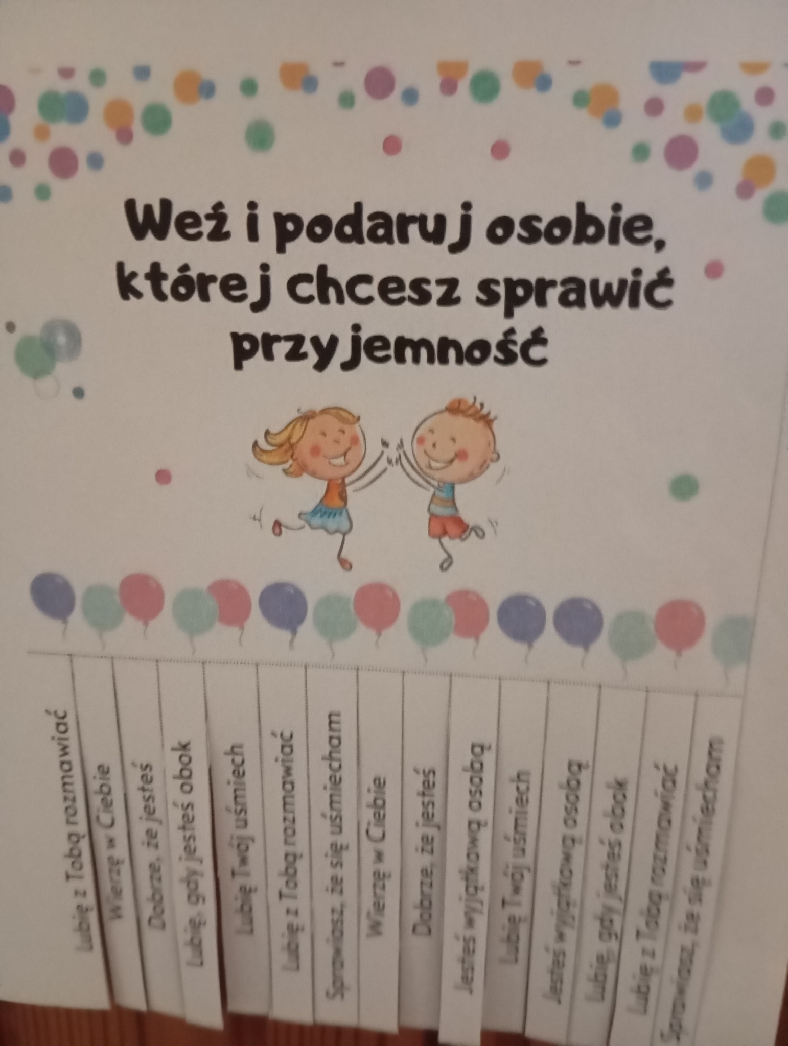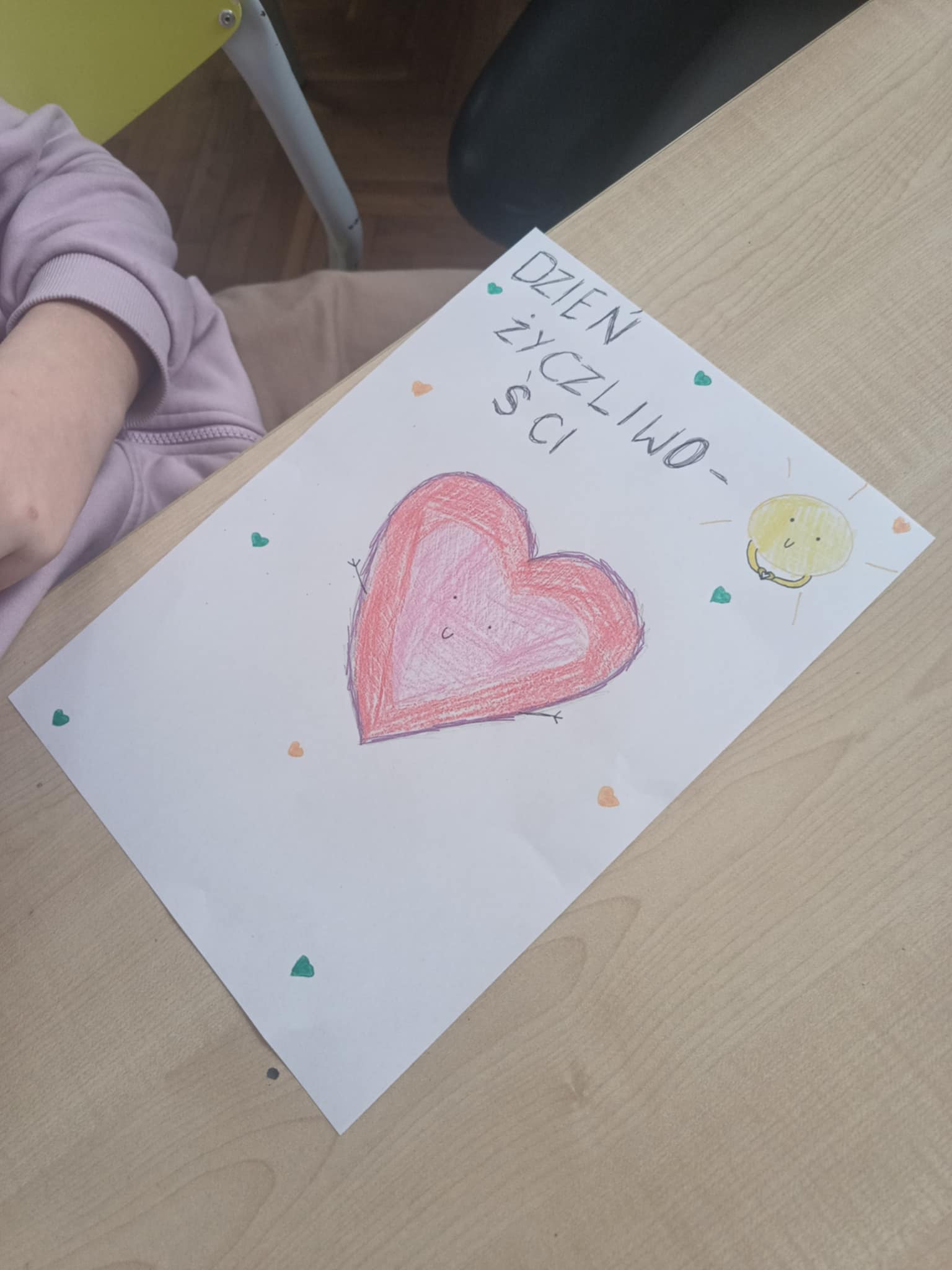 Aktualności 73 22-11-2025 21 listopada w naszej szkole obchodziliśmy Dzień Życzliwości! To wyjątkowe święto, które narodziło się z potrzeby promowania dobra, uśmiechu i pozytywnych relacji między ludźmi. Przypomina nam, jak ważne są drobne gesty – dobre słowo, pomocna dłoń czy serdeczny uśmiech. W naszej szkole uczniowie przez cały dzień dzielili się życzliwością: wymieniali się miłymi gestami, a także przekazywali sobie ciepłe słowa, które mogli oderwać z przygotowanych na korytarzach kartek. Niech życzliwość towarzyszy nam nie tylko dziś, ale każdego dnia! 0.0 Ostatnia modyfikacja: -/- Powiązane artykuły: Udział w ogólnopolskiej akcji BohaterON - 2025/2026 Olimpiada Mitologiczna 2025 Wyniki konkursu Alfik Matematyczny 2025 Boże Narodzenie 2025 - życzenia Akcja charytatywna „Paczuszka dla Maluszka" 2025 Jasełka i Wigilia - 2025 „Mała książka – wielki człowiek" - 2025 Spotkanie z podróżnikiem - Indie 2025 Paczuszka dla Maluszka - 2025 OTRZĘSINY KLASY 4 I ZABAWA ANDRZEJKOWA – 26.11.2025r. 0